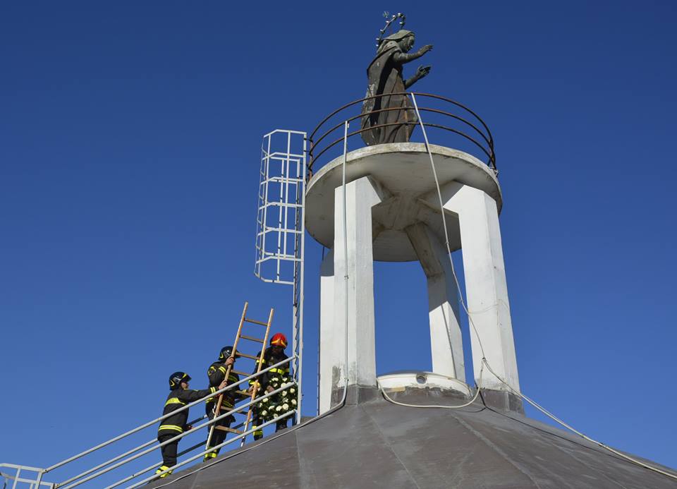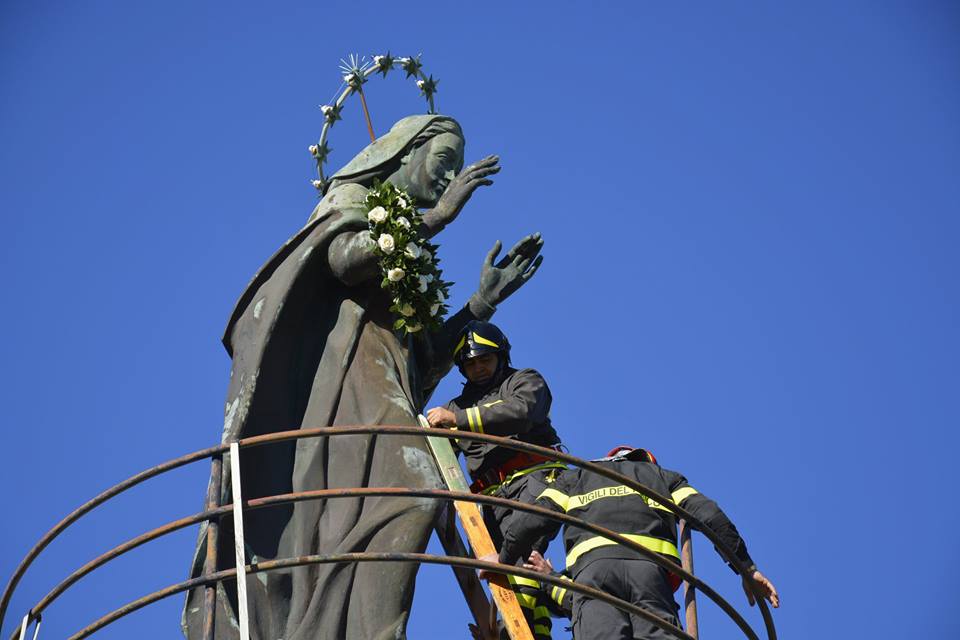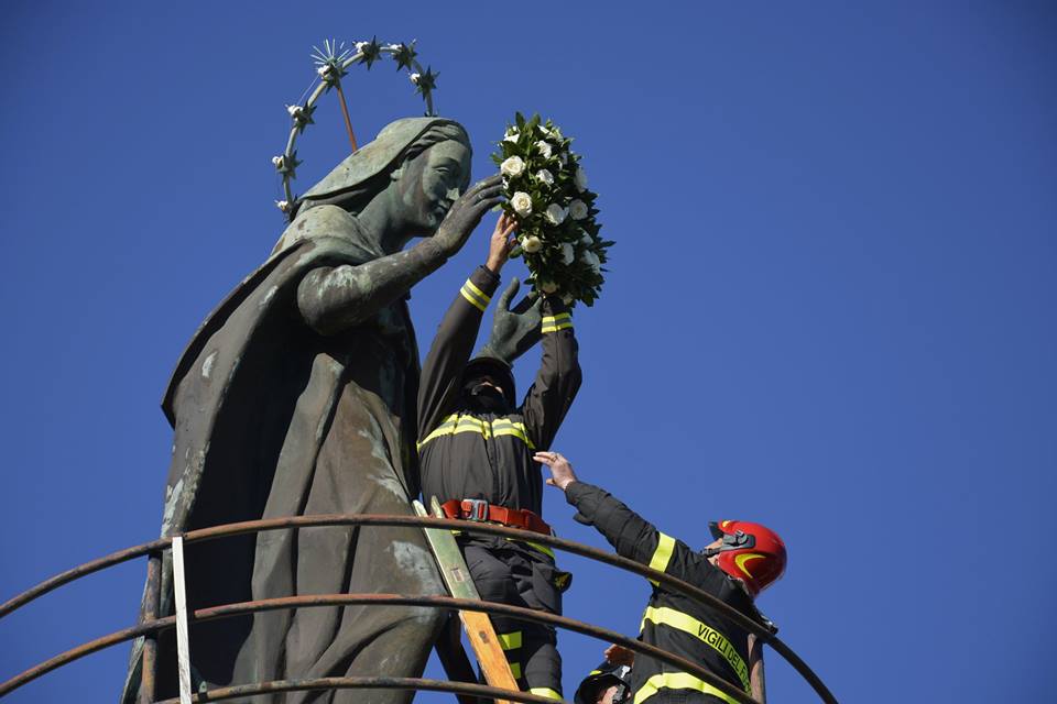 Una corona di fiori, come da tradizione, sulla statua che svetta sulla chiesa di San Giacomo Apostolo a Gaeta. Come ogni anno, per celebrare l’8 dicembre, giorno dell’Immacolata Concezione, i Vigili del Fuoco della città pontina questa mattina hanno deposto una corona di fiori sulla statua della Madonna in via Indipendenza.