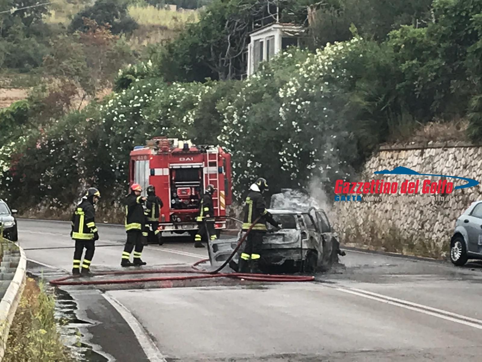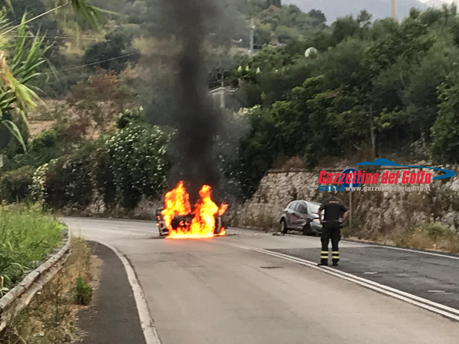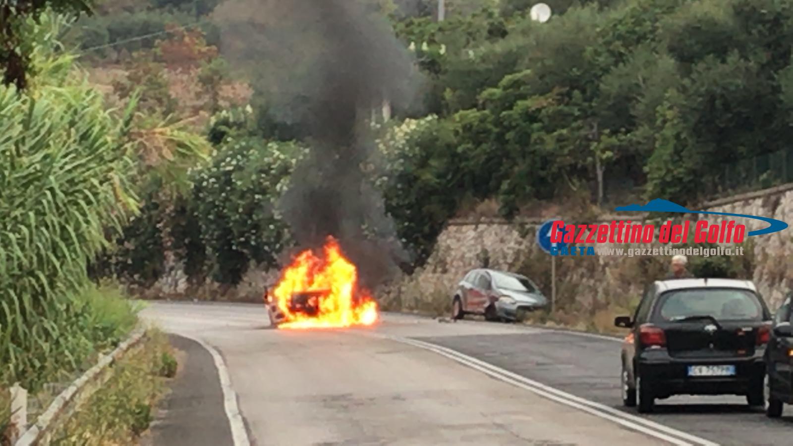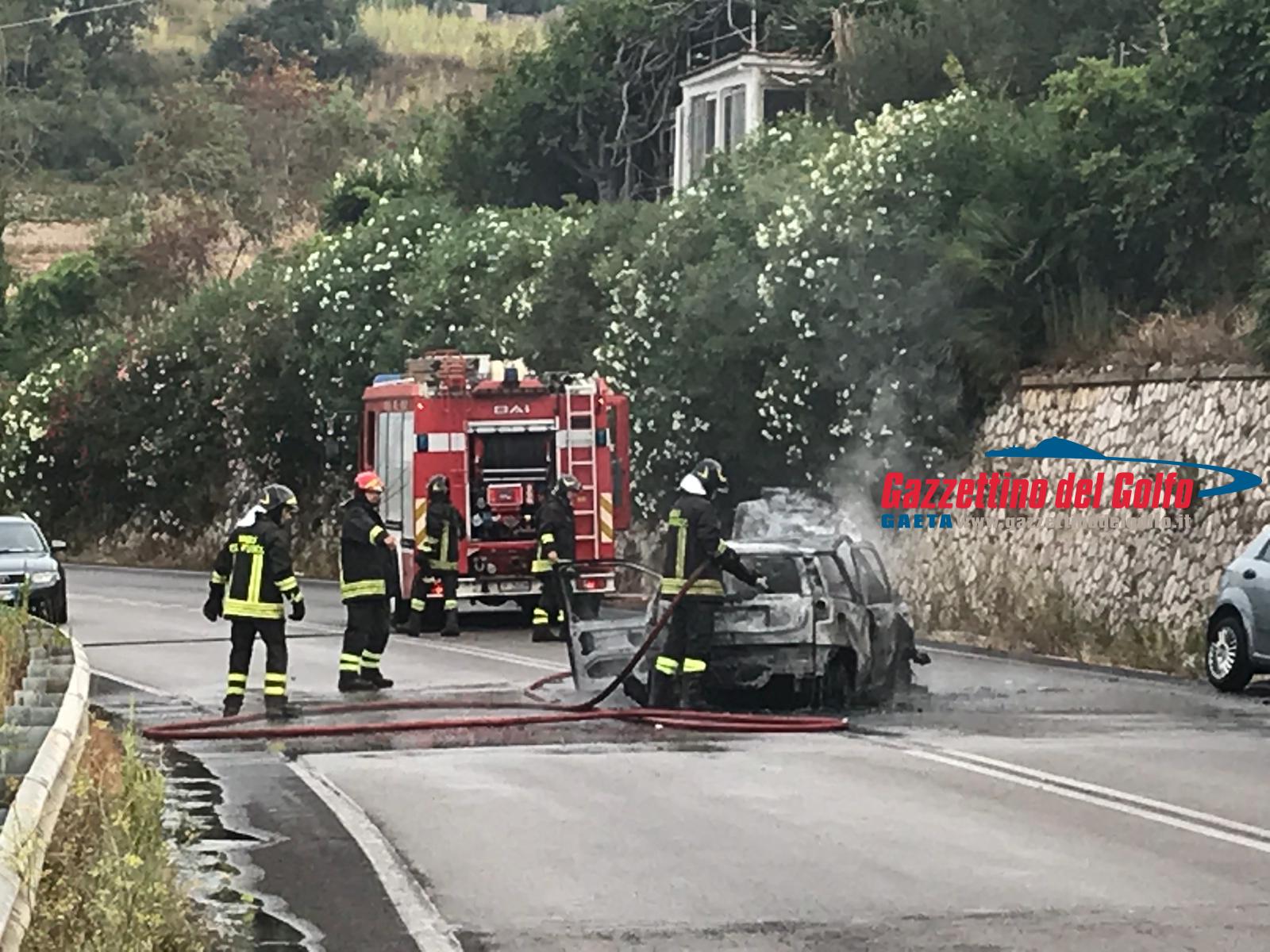 Auto in fiamme sulla Flacca, all’altezza di Gaeta, alle ore 7.15 circa di questa mattina.