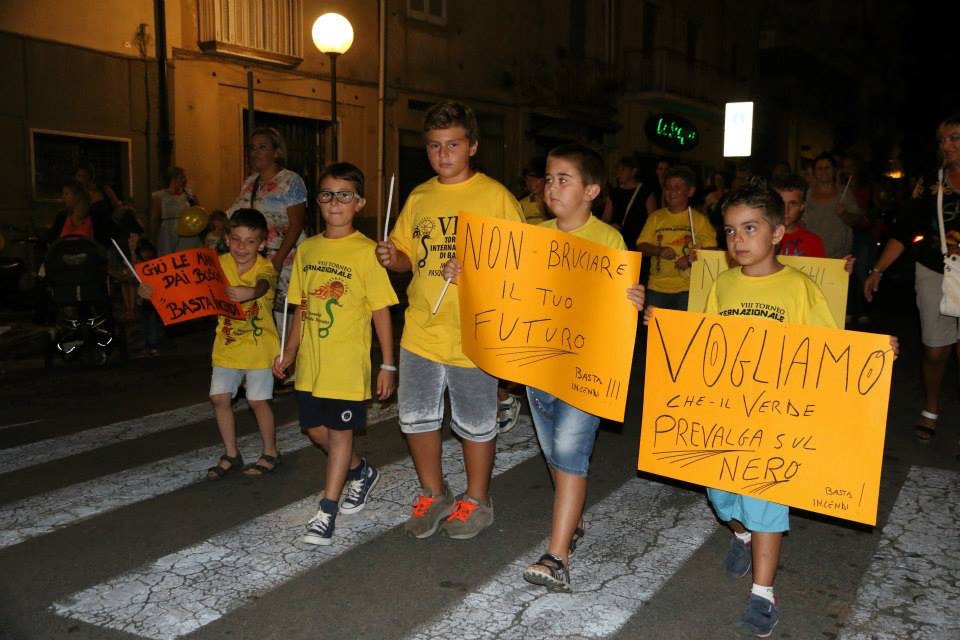“Trent’anni sono pochi – a chi appicca i fuochi”. “Non è una processione, ma una manifestazione – chi brucia le montagne, è proprio un gran coglione!”. Questi alcuni degli slogan che hanno gridato, tutti insieme, domenica sera a Itri nel corso della fiaccolata spenta che ha attraversato il centro cittadino, percorrendo due lunghi rettilinei con i partecipanti che recavano candele appositamente spente, come segno di ribellione verso l’apocalisse dei fuochi che ha devastato centinaia di ettari di boschi e montagne nel solo territorio itrano. E a testimoniare la gratitudine degli organizzatori (vedi il sito Facebook “Basta incendi – fiaccolata spenta”) per la partecipazione “composita e geograficamente estesa” cui ha preso parte, nelle vesti ufficiali di delegato dal commissario prefettizio, dott. Raffaella Vano, il dirigente comunale Pasquale Manzo, sono risuonate le parole del presidente dell’associazione dei volontari della Protezione Civile E.R.I. di Itri, Antonio Maggiacomo, che ha esteso il suo grazie “agli amici che rappresentano le associazioni Alfa di Aprilia, C.B. Rondine Aprilia, Gruppo Comunale Albano , V.E.R. di Formia, A.E.G.O. di Castelforte- Angeli dell’Ambiente , C.O.I. di Minturno, E.R.I. di Itri e tutti gli aderenti di queste associazioni con le quali ormai ci conosciamo da anni e che rappresentiamo questa bella realtà del Coordinamento FO.P.I.VOL, il cui presidente Roberto Cotterli di Aprilia è qui tra noi. Infine ringrazio i Falchi di Fondi” del presidente Mario Marino, anche loro protagonisti di giornate e nottate eroiche nel salvamento di vite umane dalle fiamme divoratrici di boschi, montagne, animali e attentatrici di case e di anziani che rischiavano di restarci arsi dento se fosse mancato l’aiuto di tanto encomiabili volontari. C’erano i tanti volontari per lo spegnimento incendi dell’associazione faunistico-venatoria “fra’ Diavolo” con il loro presidente Silverio Sinapi a guidarli. C’erano l’ing. Vincenzo Ialongo, dirigente della Nuova Itri Calcio, Angelo Pelliccia, direttore generale della nuova società calcistica “Briganti” rappresentata anche dai dirigenti Teo Trufas, Antonio Cardillo e Giuseppe Sinapi. C’era la chiesa, con don Maurizio Di Rienzo, giovanissimo viceparroco dell’intero paese che ha rivolto parole di “composta ma dura condanna“ per chi uccide la Natura, facendo un applaudito riferimento a San Francesco d’Assisi, cantore del Creato come manifestazione dell’Amore di Dio verso gli uomini. C’erano i bambini ad aprire il lungo corteo, c’erano forestieri, c’era la gente che ha inteso portare la sua civile protesta in per le strade, applaudita dai tanti astanti che dai marciapiedi o dai tavolini dei bar hanno salutato entusiasticamente il corteo in transito. A fine manifestazione, prima di congedarsi dai presenti, il conduttore della serata, dott. Riviera, ha annunciato il prossimo momento di testimonianza propositiva portato avanti dal gruppo “Basta incendi”. Sulla scorta delle vecchie feste dell’albero, a novembre verranno piantati tanti nuovi alberelli, ognuno dedicato e con il nome dei bambini nati nel 2014.