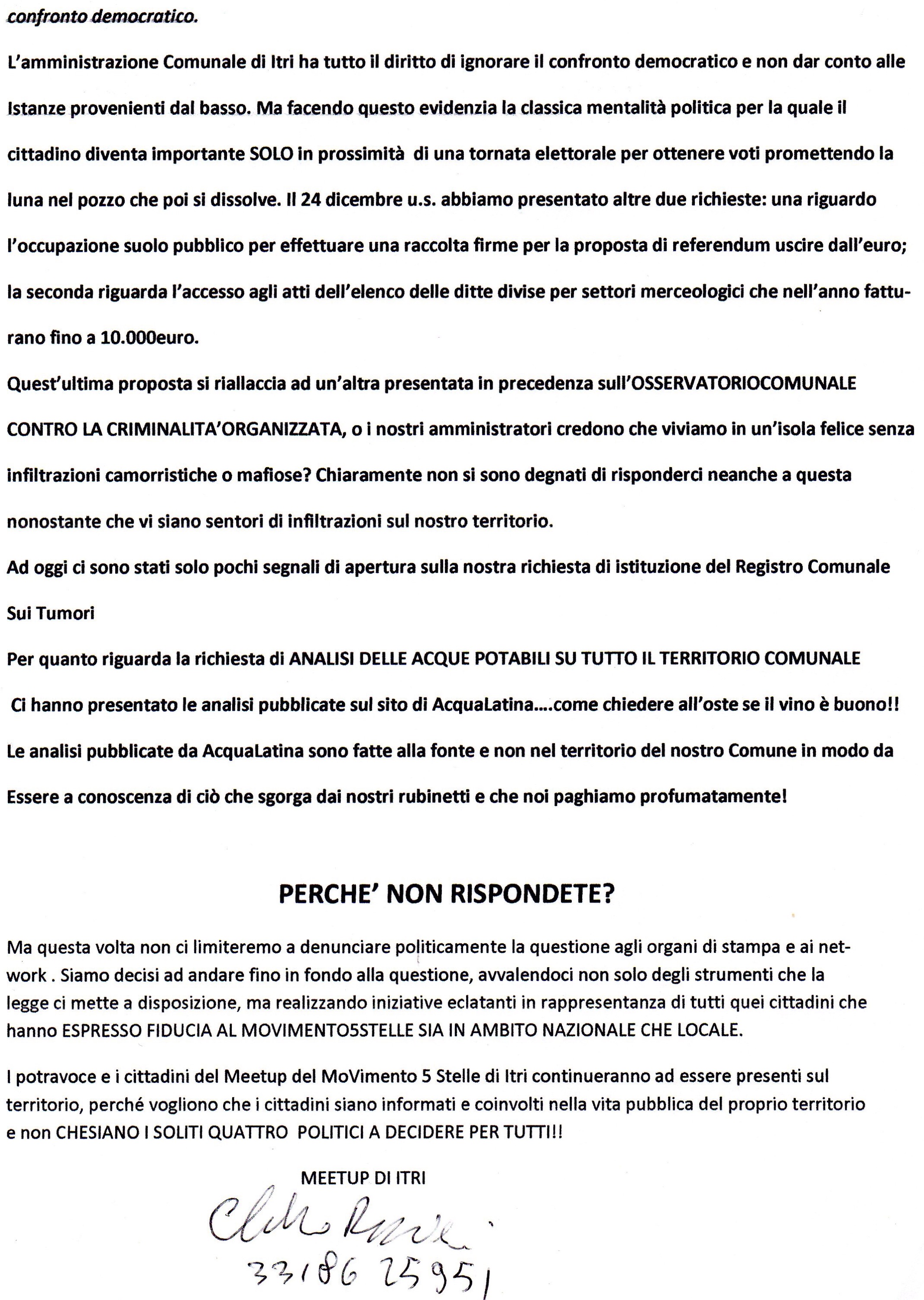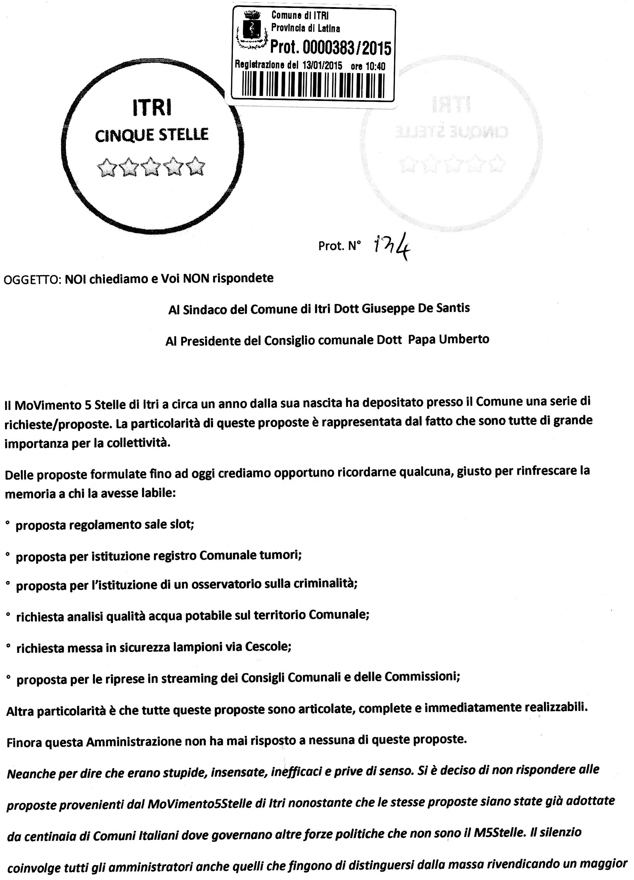 Ecco la missiva inviata dal Movimento 5 Stelle di Itri indirizzata al Sindaco De Santis e al Presidente del Cnsiglio Comunale Papa.