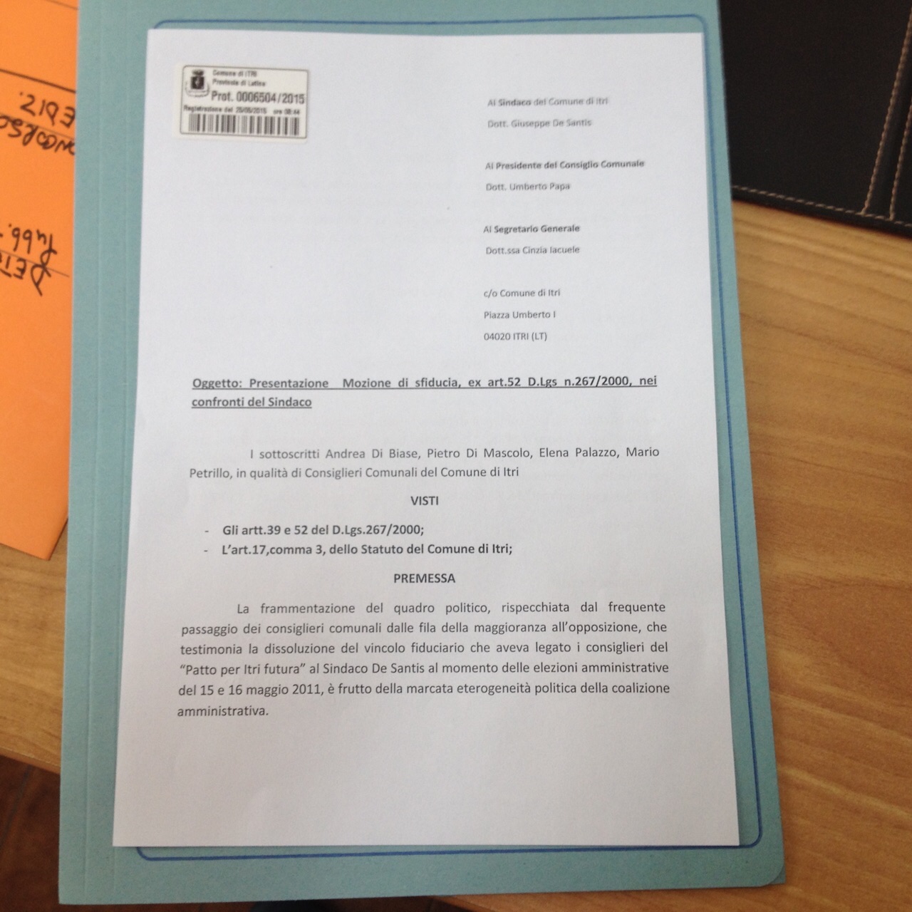 Mozione di sfiducia nei confronti del sindaco di Itri, Giuseppe De Santis.