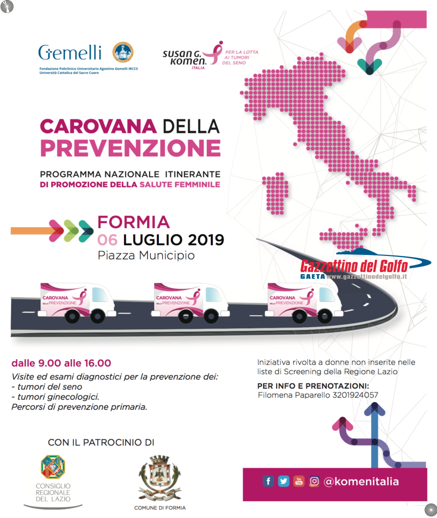 La Carovana della Prevenzione approda a Formia in Piazza Municipio il 6 luglio dalle ore 9.00 alle ore 16.00. Il Programma Nazionale Itinerante di Promozione della Salute Femminile è organizzato congiuntamente dalla Fondazione Policlinico Universitario Agostino Gemelli e dalla Susan G. Komen Italia, con il patrocinio del Consiglio Regionale del Lazio e del Comune di Formia.