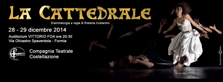 Torna a Formia “LA CATTEDRALE”, il miglior spettacolo europeo 2014 Festival APOSTROF di Praga, della Compagnia Teatrale Costellazione. Gli spettacoli sono attesi per domenica 28 e lunedi 29 dicembre 2014 ore 20:30 all’AUDITORIUM VITTORIO FOA con il contributo del Comune di Formia; la Compagnia Teatrale di Costellazione torna nella sua città natale per festeggiare con i suoi concittadini un’annata densa di emozioni, di repliche, di successi e alti riconoscimenti sui palcoscenici italiani ed europei.