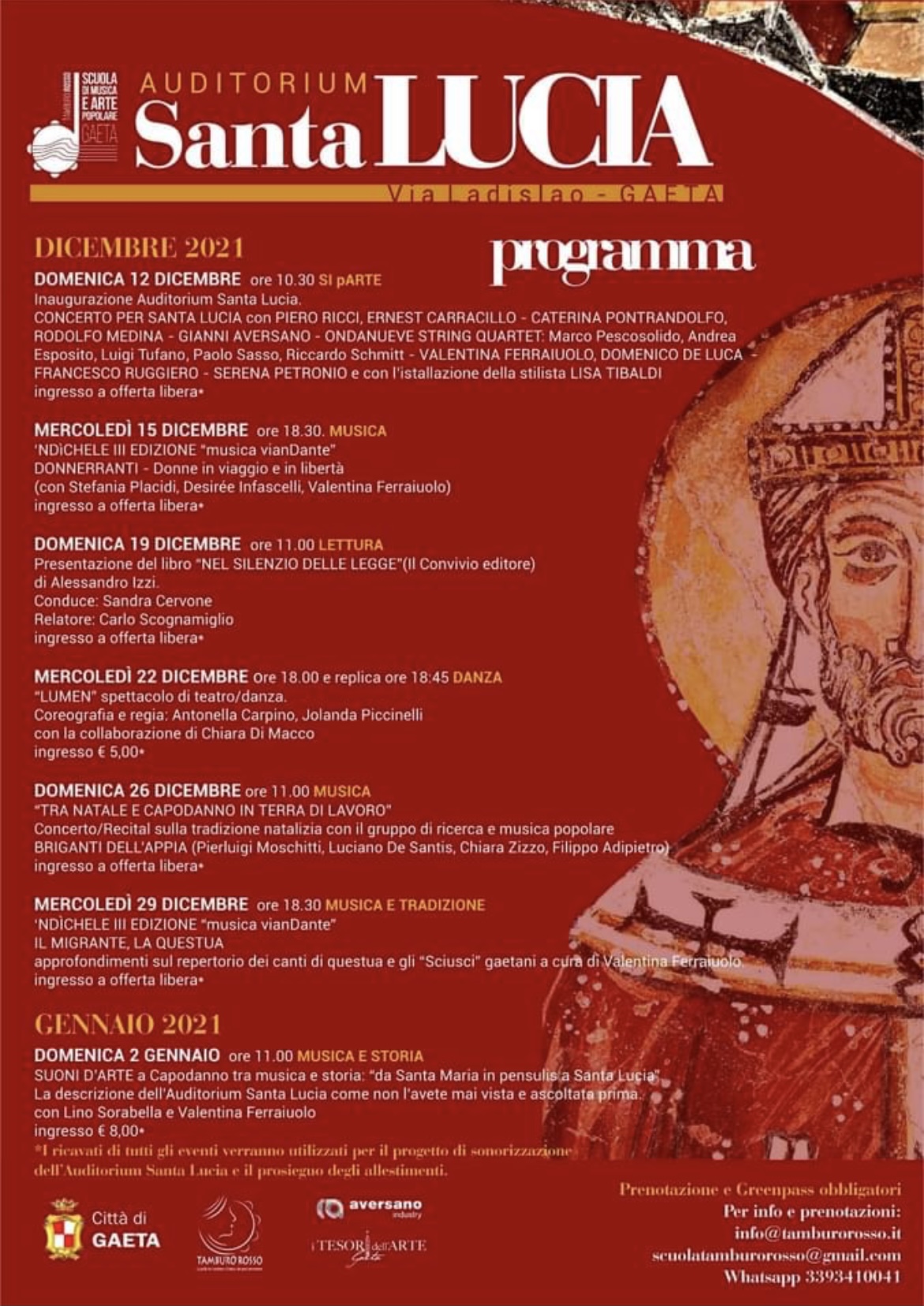 Dalla chiesa più antica nel cuore di Gaeta Medievale, nasce un nuovo centro culturale per la città. Grazie all’impegno della presidente dell’Associazione Tamburo Rosso Valentina Ferraiuolo e della delegata alle politiche sociali Lucia Maltempo, è stato inaugurato ieri l’Auditorium Santa Lucia.