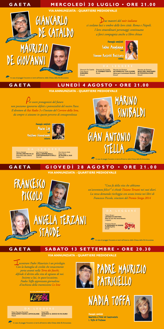 Gaeta ospita, dunque, tutti gli appuntamenti della XXI edizione di “Libri sulla Cresta dell’Onda”, nel suo cuore storico: Gaeta Medievale, sul magnifico sagrato della chiesa della SS. Annunziata. E si prepara a vivere un’esperienza indimenticabile, con grandi nomi del panorama letterario italiano. Gli ospiti, scrittori e giornalisti, apriranno interessanti discussioni e dibattiti, lasciando in ciascuno di noi, al termine della serata, quel desiderio pungente di riflettere e condividere visioni considerazioni, sentimenti, espressi nel più bel salotto letterario del Golfo.