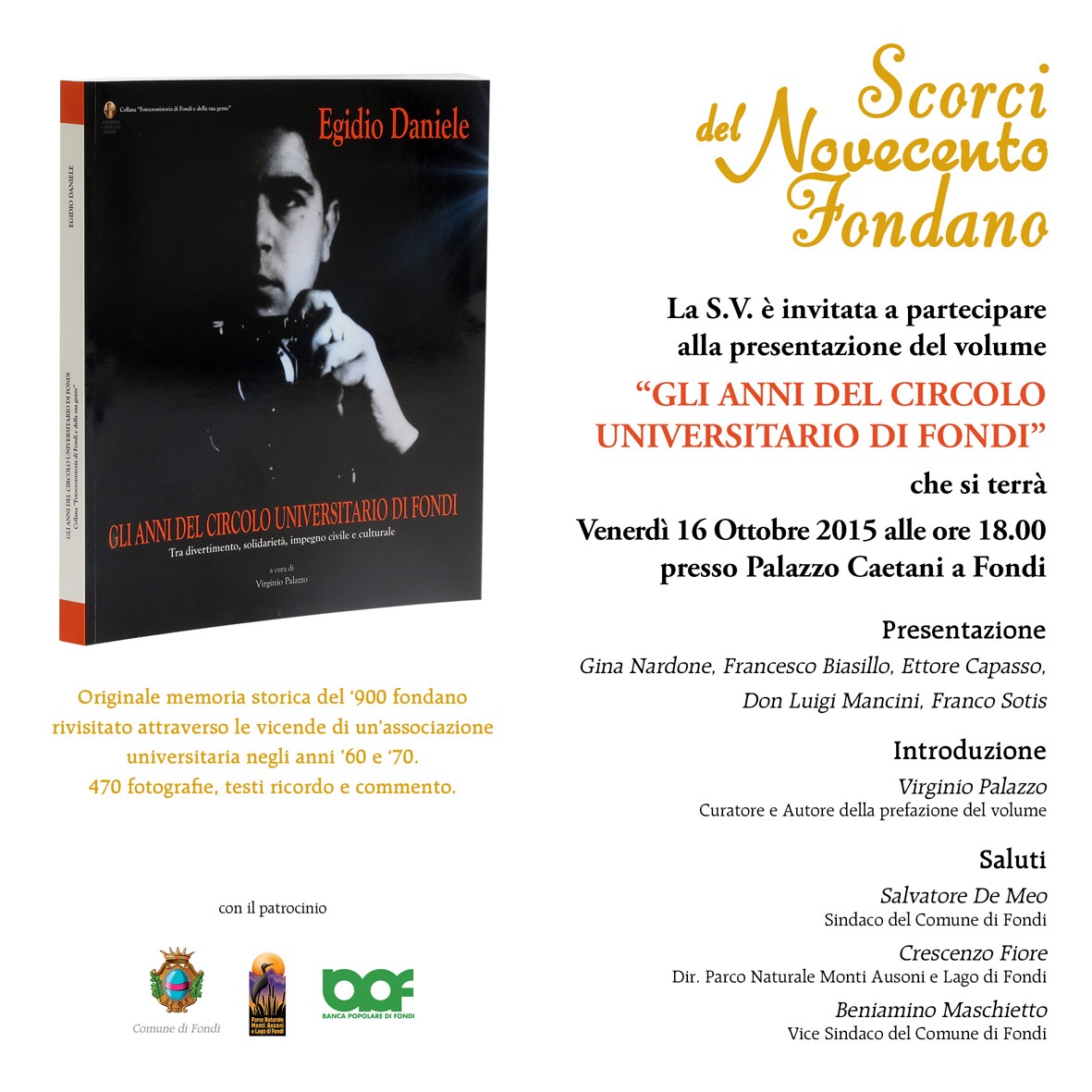 Ci sarà una presenza composita e autorevolissima di studiosi, critici, amministratori e memorie storiche della città, venerdi 16, alle ore 18,00, presso Palazzo Caetani a Fondi, a dare voce alle testimonianze e alle impressioni e a rinverdire i ricordi delle stagioni tanto fertili del confronto e del dibattito che hanno caratterizzato i decenni segnati dall’attività del Circolo universitario di Fondi. In una pagina che resterà storica negli “Scorci del Novecento fondano”, ai quali hanno dato volto gli scatti irripetibili di Egidio Daniele, autore dell’opera e fotografo di tante stagioni giornalistiche presso il quotidiano “Il Tempo”, viene presentata l’originale memoria storica del ‘900 fondano rivisitato attraverso le vicende di un’associazione universitaria negli anni ‘60 e ’70. Nell’opera sono presenti ben 470 fotografie corredate da testi ricordo e commento. “Tra divertimento, solidarietà, impegno civile e culturale” recita il sottotitolo dell’opera da nicchia curata da Virginio Palazzo, espressione di quel costruttivo mecenatismo fondano che lascerà alle future memorie il segno vivo del fermento socio-culturale di una città in continua crescita anche in questi campi che ne perpetuano la vocazione a recitare il ruolo della culla della cultura pontina. Prestigiosi i nomi dei presentatori: Gina Nardone, Francesco Biasillo, Ettore Capasso, don Luigi Mancini e Franco Sotis. Virginio Palazzo, curatore e autore della prefazione del volume, terrà poi l’introduzione cui seguiranno i saluti portati dal sindaco di Fondi, Salvatore De Meo, dal direttore del Parco Naturale Monti Ausoni e Lago di Fondi, Crescenzo Fiore, e di Beniamino Maschietto, vicesindaco della città.