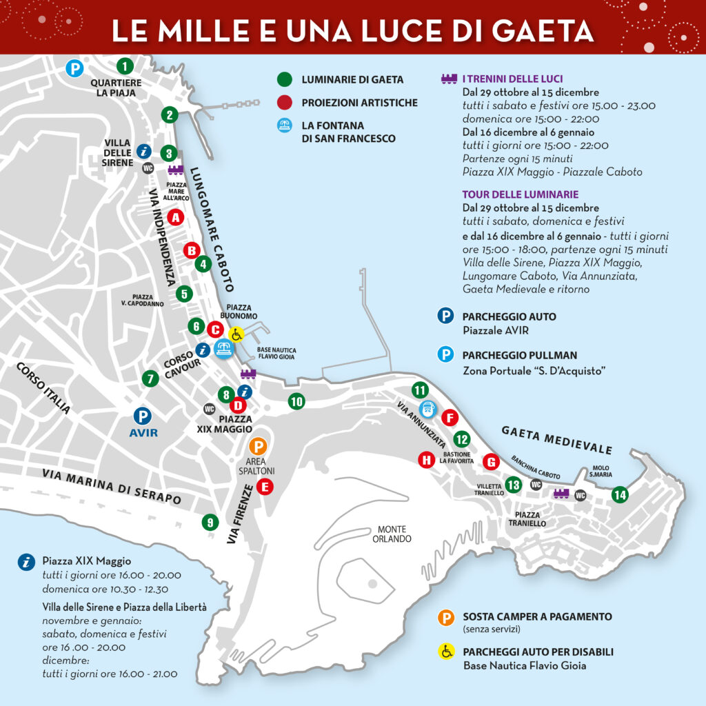 Chiesa dei SS. Cosma e Damiano “Madonna nostra”, Piazza Mare all’Arco – Piazza Mazzoccolo “La notte di Natale”, Piazza Buonomo “Comics streeets”, Piazza della Libertà – Piazza Di Liegro – Piazza XIX Maggio “Xmas fantasy, Tempio di S.Francesco “Gaeta celebra S. Francesco”.