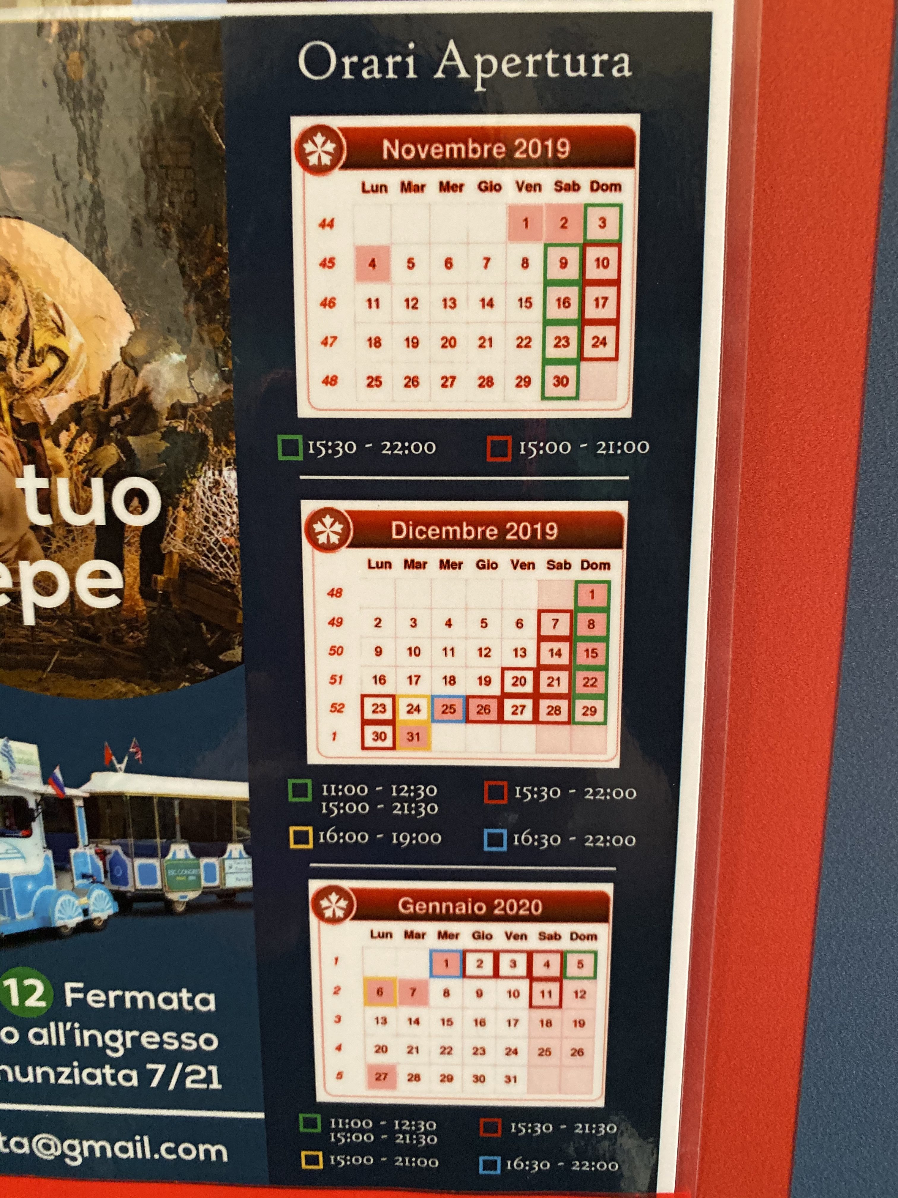 A novembre il Villaggio Incantato è aperto tutti i fine settimana, il sabato dalle 15.30 alle 22 e la domenica dalle 15 alle 21; aperture continuative a dicembre, oltre agli orari di novembre anche la domenica mattina dalle 11 alle 12.30 e ininterrottamente dal 22 dicembre al 6 gennaio.