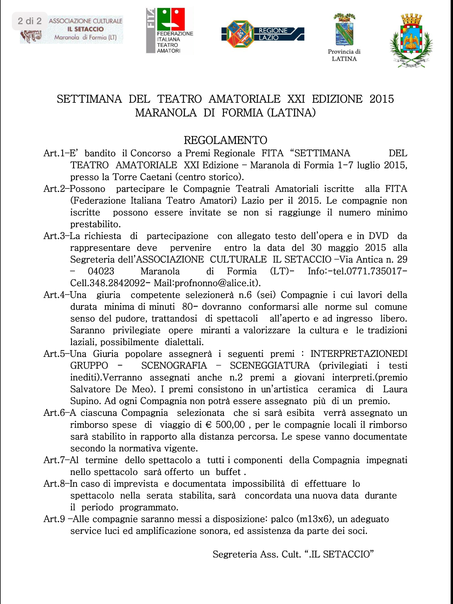 Per informazioni su bando e regolamento: tel.0771.735017 cell.348.2842092 profnonno@alice.it, sulla pagina facebook “Setaccio Formia”, su www. ilsetaccioformia.wix.com/ilsetaccioformia