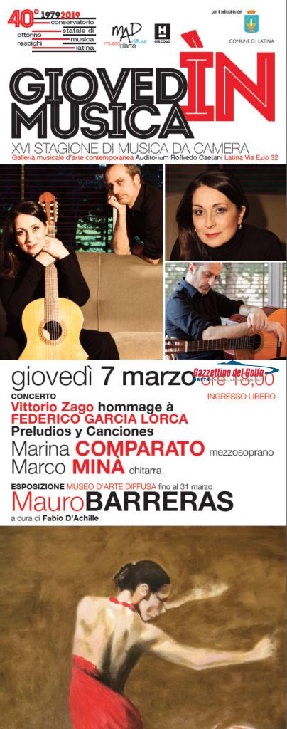 Marina Comparato e Marco Minà, due grandi artisti di fama internazionale presentano “Vittorio Zago hommage a Federico Garcia Lorca, Preludios y Canciones” giovedì 7 marzo 2019, alle ore 18, presso l’Auditorium Roffredo Caetani del Conservatorio di Musica Ottorino Respighi di Latina.