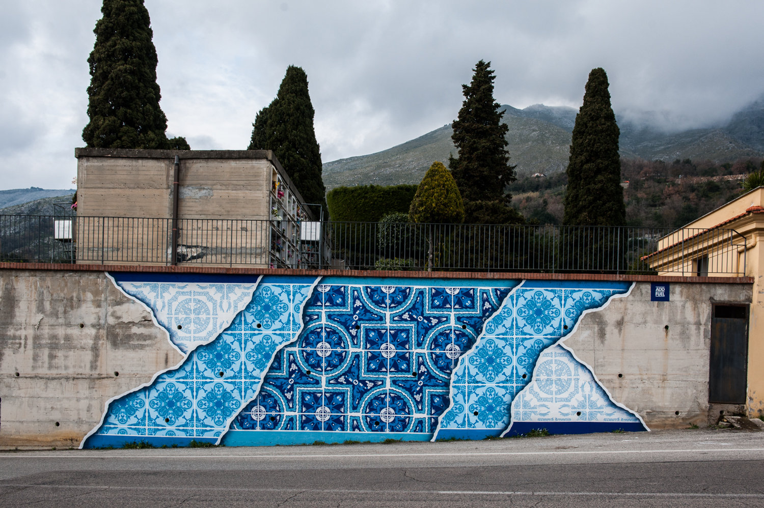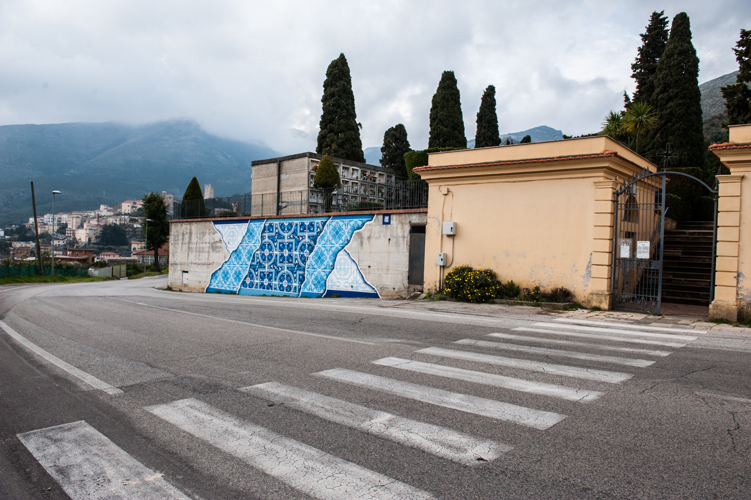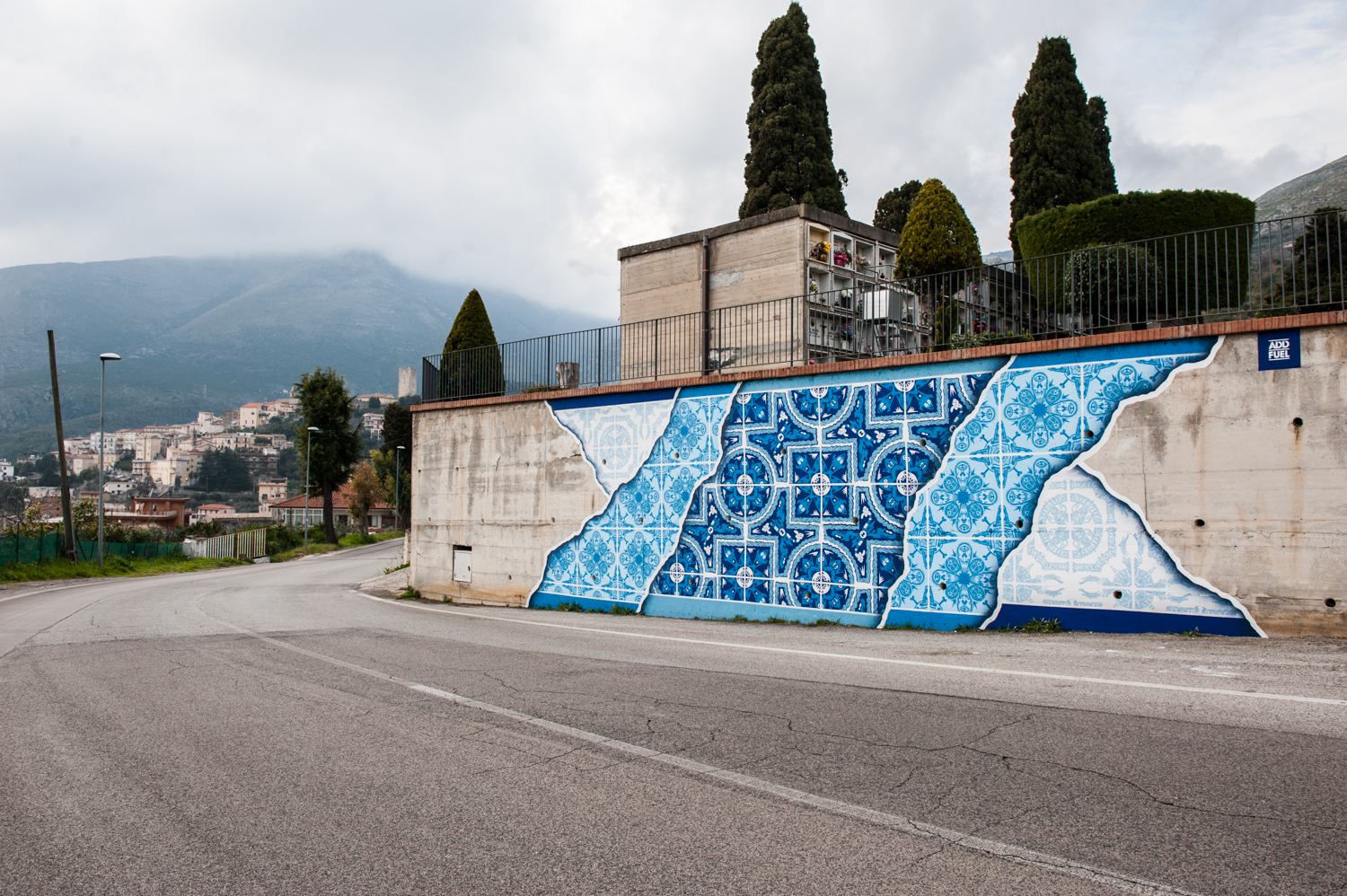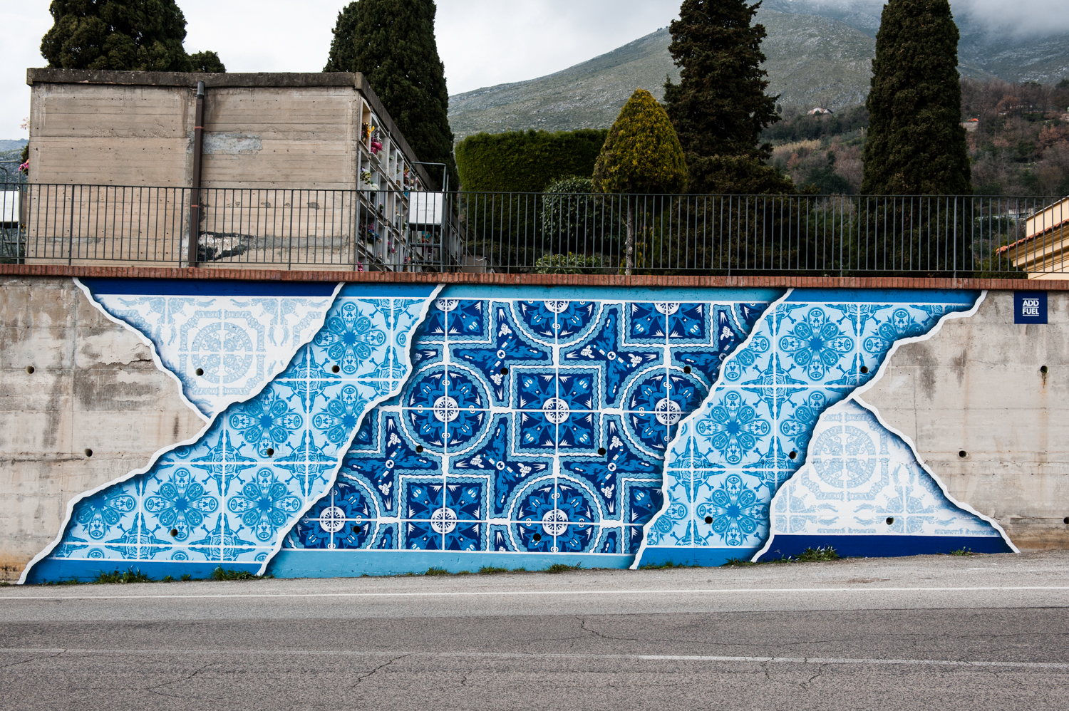 Protagonista dell’intervento l’artista portoghese Diego Machado, alias Add Fuel, autore di uno splendido murale sul perimetro del cimitero di Maranola. Utilizzando la tecnica stencil, Add Fuel rivisita gli stilemi caratteristici degli azulejos, le tipiche piastrelle in ceramica della tradizione portoghese.