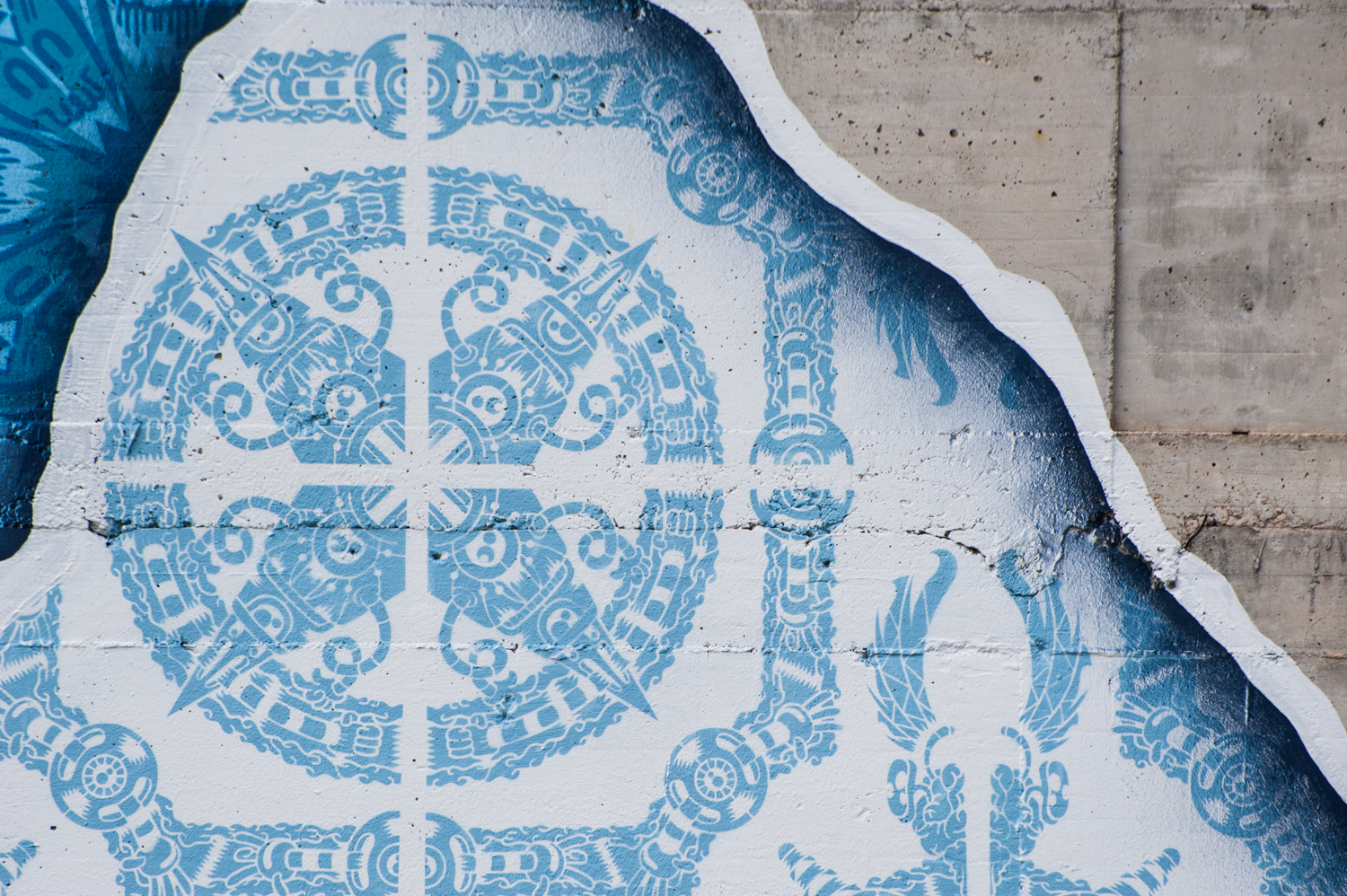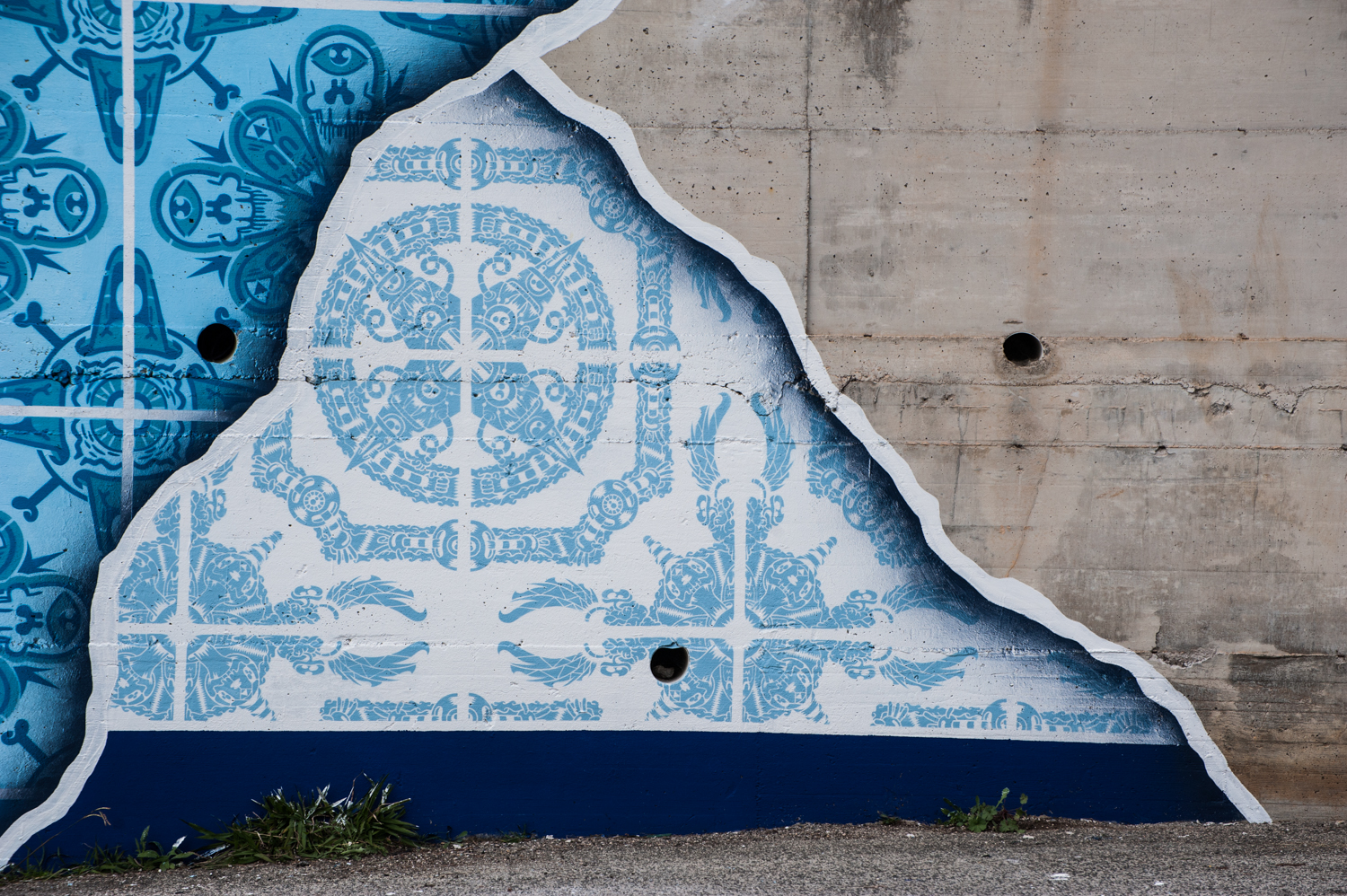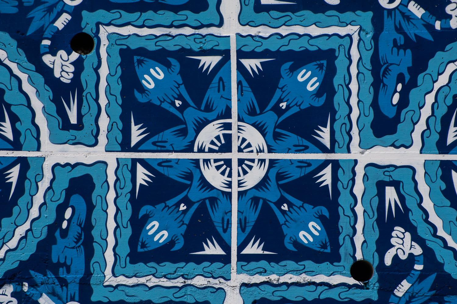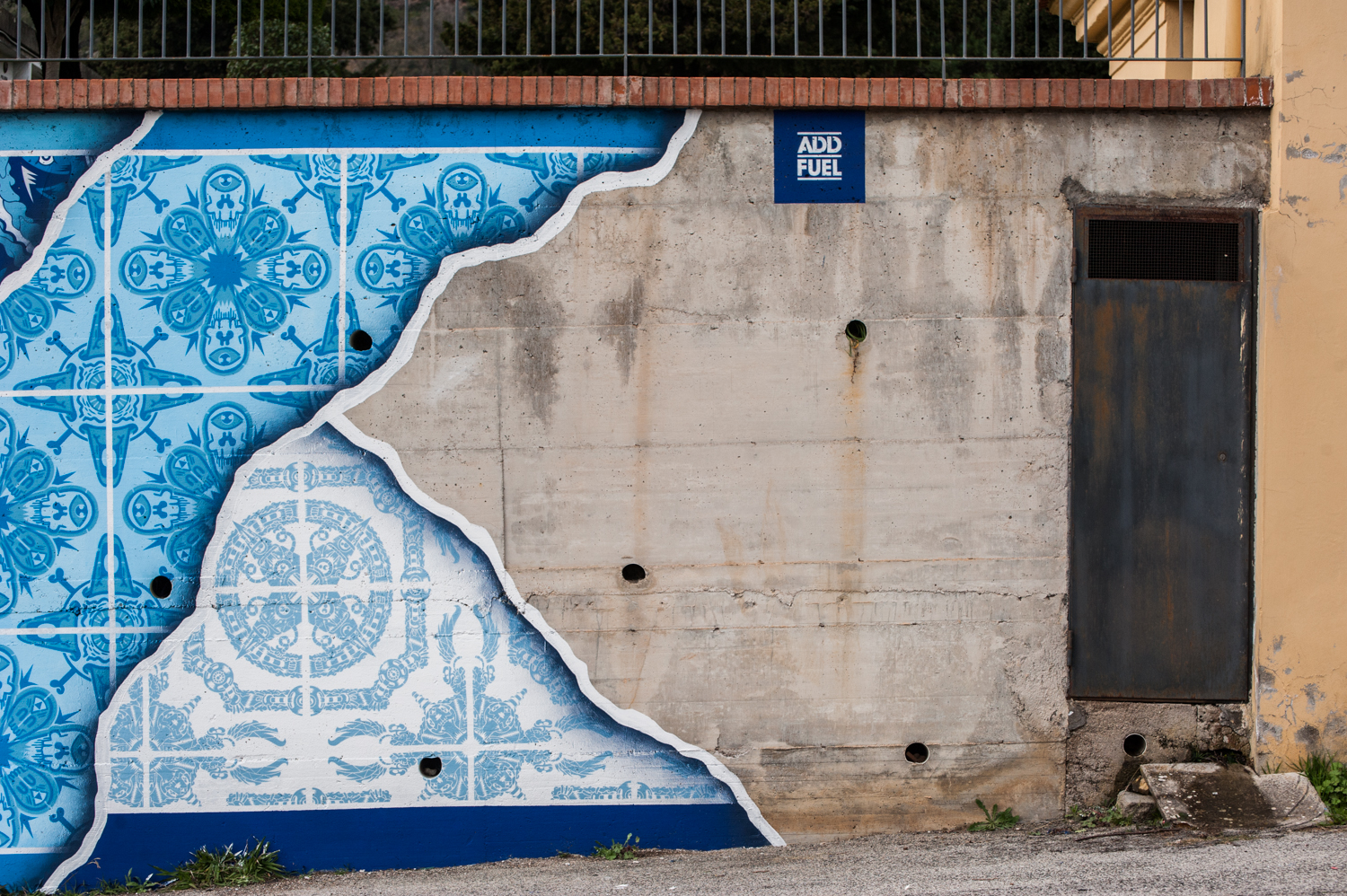 Protagonista dell’intervento l’artista portoghese Diego Machado, alias Add Fuel, autore di uno splendido murale sul perimetro del cimitero di Maranola. Utilizzando la tecnica stencil, Add Fuel rivisita gli stilemi caratteristici degli azulejos, le tipiche piastrelle in ceramica della tradizione portoghese.