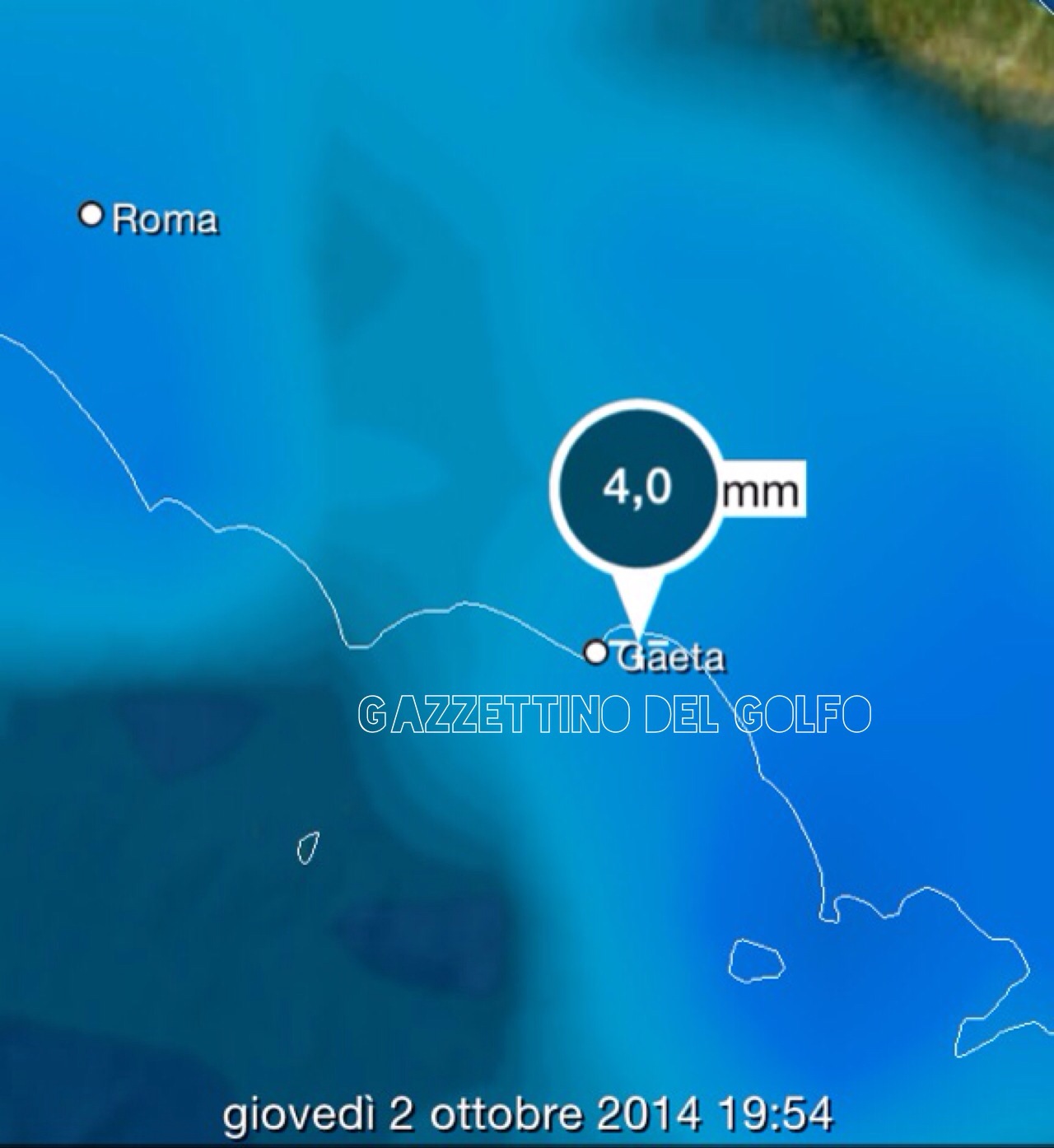 Nel Golfo di Gaeta per la giornata di giovedì , sono previsti 12mm di pioggia. Durante la giornata la temperatura massima registrata sarà di 22°C, la minima di 18°C, con venti al mattino assenti o deboli e proverranno da direzione variabile, al pomeriggio deboli e proverranno da Ovest, mare poco mosso.