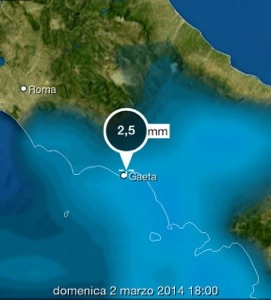 Nel Golfo di Gaeta domani cieli saranno molto nuvolosi o coperti con piogge e rovesci anche temporaleschi. In serata attenuazione dei fenomeni, sono previsti 22mm di pioggia. Durante la giornata di domani la temperatura massima registrata sarà di 12°C, la minima di 8°C. I venti saranno al mattino moderati e proverranno da Sud, al pomeriggio deboli e proverranno da Ovest-Sudovest, mare molto mosso.