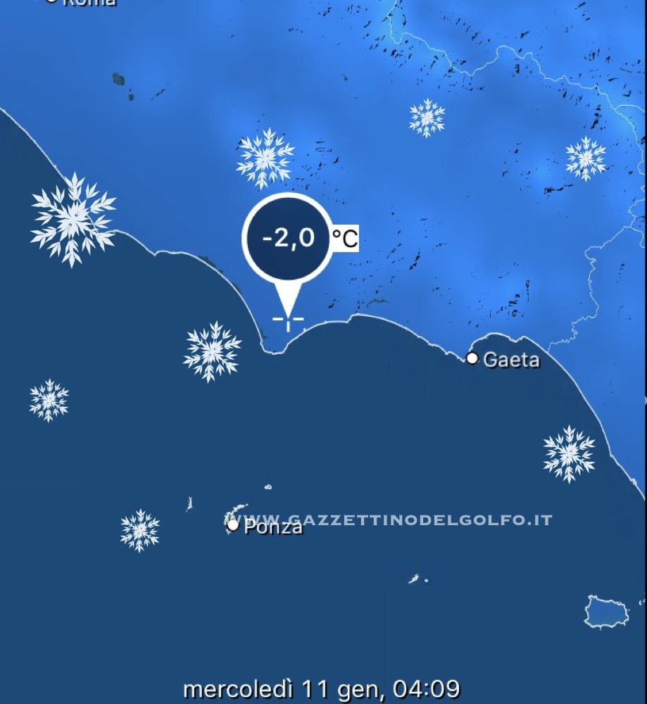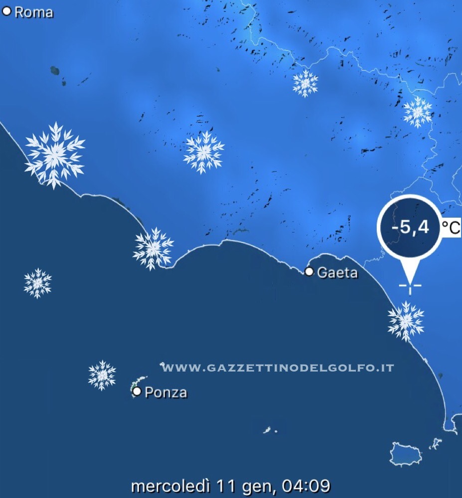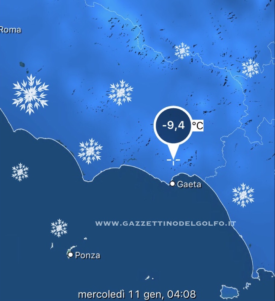 Un’ulteriore ondata di gelo colpirà l’ltalia centrale ed il Golfo di Gaeta con temperature che scenderanno ulteriormente di qualche grado. Il picco, almeno secondo le previsioni, dovrebbe avvenire nella nottata fa martedì e nelle prime ore del mercoledì 11 gennaio 2017 con una temperatura percepita di circa -6°C.