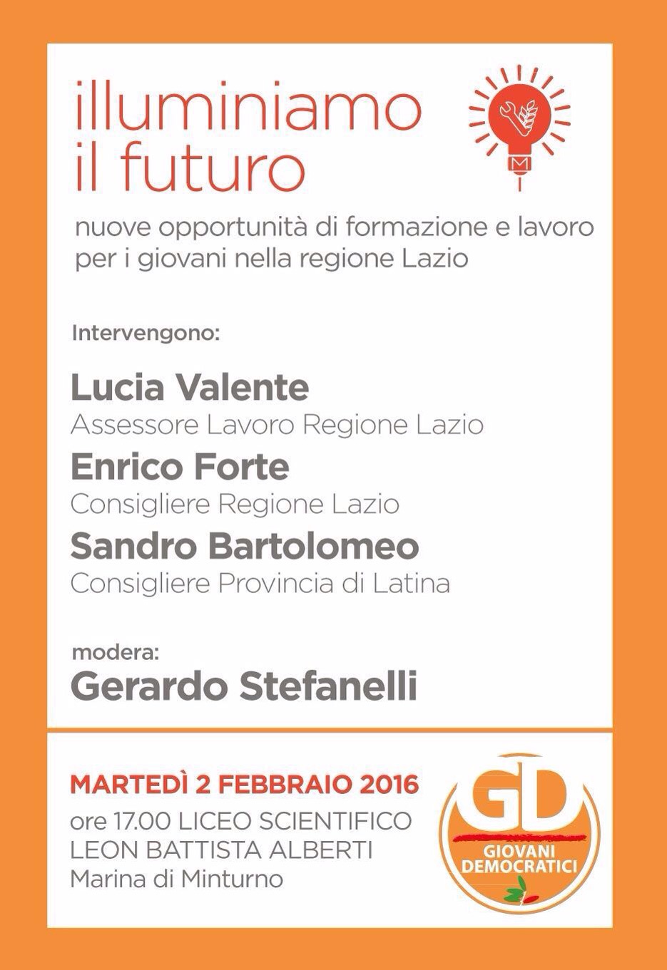 “Illuminiamo il futuro” è il nuovo incontro tematico organizzato dai Giovani Democratici di Minturno, che riguarderà le opportunità di formazione e lavoro della Regione Lazio. Interverranno Lucia Valente, Assessore Lavoro Regione Lazio; Enrico Forte, Consigliere Regione Lazio; Sandro Bartolomeo, Consigliere Provincia di Latina. A moderare l’incontro sarà Gerardo Stefanelli, candidato a sindaco di Minturno.L’incontro si svolgerà martedì 2 Febbraio 2016, alle ore 17, presso il Liceo Scientifico “Leon Battista Alberti” di Marina di Minturno.