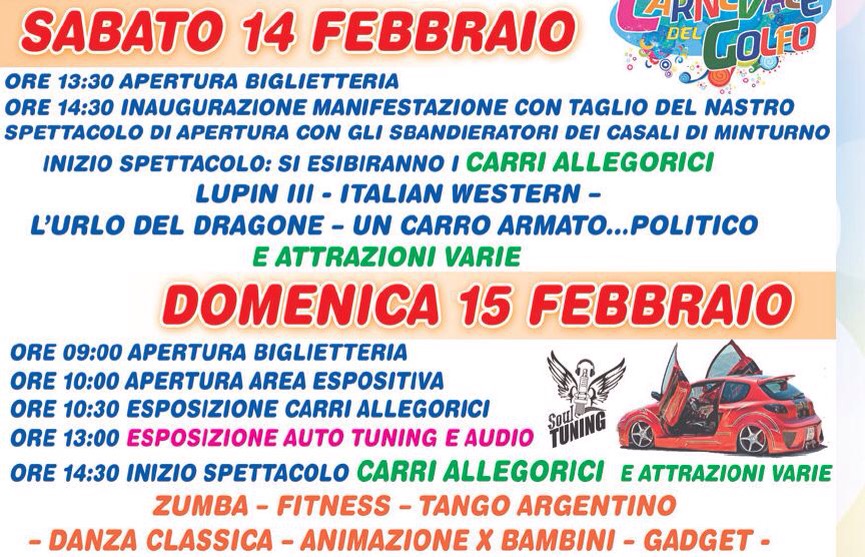 Animazione, stand espositivi e gastronomici, parco giochi per bambini, area baby, luna park, area pic-nic e naturalmente l’attesissimo spettacolo straordinario dei carri allegorici! I maestri cartapestai con oltre 30 anni di esperienza anche quest’anno sono pronti a stupire il pubblico con le creazioni meravigliose dei carri allegorici. Gesso, carta di giornale e colla sono gli ingredienti semplici per un grande spettacolo. Un duro lavoro fatto di sacrifici e di notti insonni ma tutto è realizzato in un clima di gioia e con la voglia di stupire il pubblico con effetti coreografici, scenografici, grazie alla cura nella modellatura e nella colorazione, la musica, il brio dei figuranti, uniti alla spettacolarità dei movimenti che sfidano le leggi della fisica e che con le loro immagini grottesche regalano sorrisi e buonumore. La manifestazione sarà corredata da vari concorsi a premi come il gruppo mascherato più bello e vincere il “tesoretto di Re Carnevale”. L’iscrizione è gratuita e aperta a tutti coloro che vogliono partecipare. Sabato 14 inizio della manifestazione alle ore 14:30 con il taglio del nastro e lo spettacolo degli sbandieratori dei casali di Minturno. Domenica 15 l’apertura è alle ore 10.00 con l’esposizione dei carri allegorici dove piccoli e grandi potranno fotografarsi vicino ai carri allegorici divertirsi con il luna-park, con l’animazione per bambini e attrazioni varie (zumba, tango argentino, danza classica e latino-americano). Inoltre ci sarà l’esposizione Auto Tuning e audio. Nel corso della manifestazione sarà realizzato un DVD e un servizio fotografico disponibile al termine della stessa. L’ingresso e’ di € 3,50 per tutti i bambini fino a 110 cm l’entrata è gratuita.