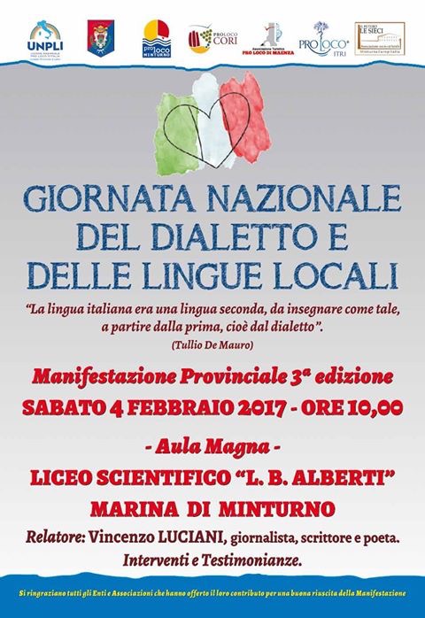 Sabato 4 febbraio a partire dalle ore 10:00 presso l’Aula Magna del Liceo Scientifico “Leon Battista Alberti” di Marina di Minturno (LT), si svolgerà la Giornata Nazionale del Dialetto e delle lingue locali a carattere provinciale.