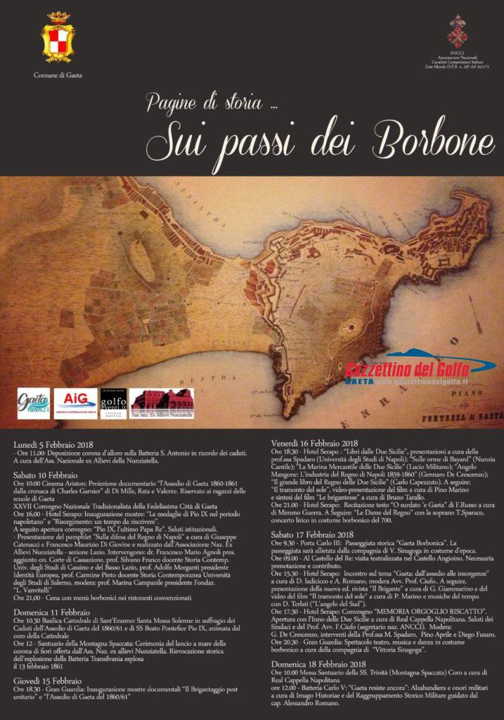 Il ricco programma di “Pagine di storia …Sui passi dei Borbone” con eventi culturali, convegni, presentazione di libri, incontri con studenti, spettacoli teatrali e concerti in rigoroso stile borbonico è scaricabile dal sito istituzionale del Comune di Gaeta e dal sito GaetaTurismo.