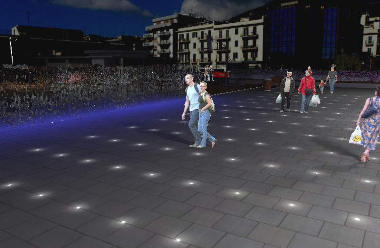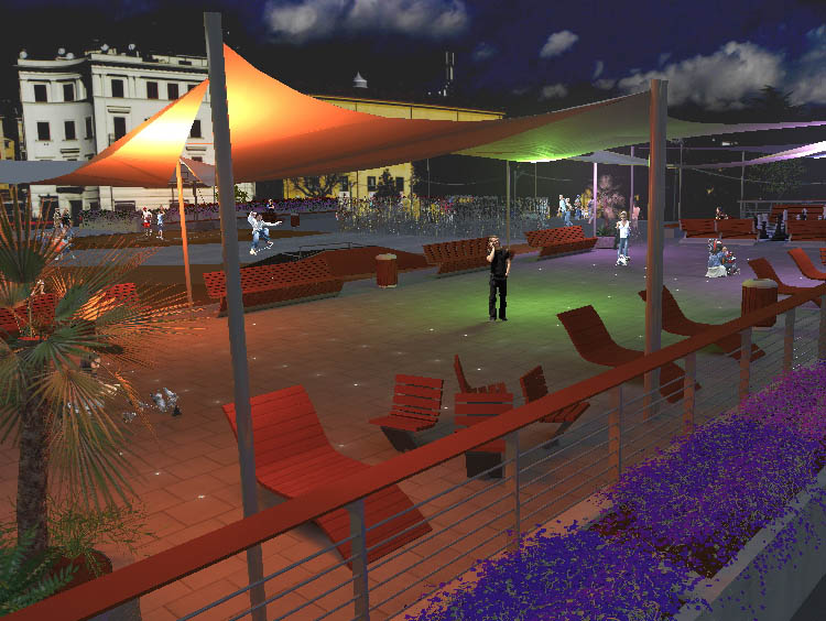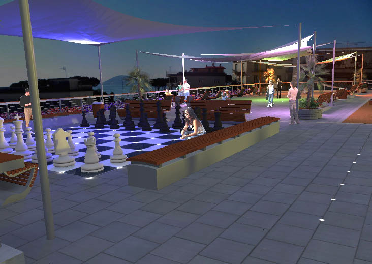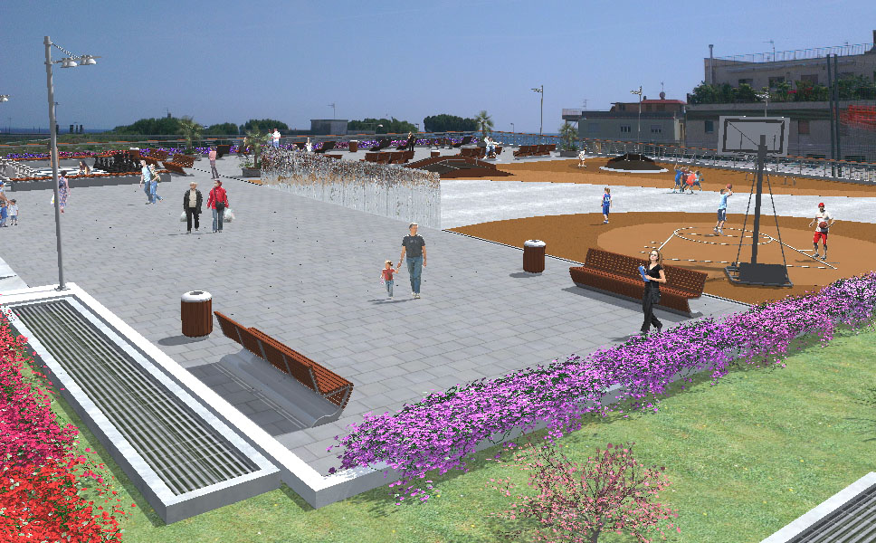 Oltre all’eliminazione dei vasconi, il nuovo progetto prevede la realizzazione di servizi igienici al piano inferiore (lato ingresso parcheggio) e una fontana a lamina d’acqua che, d’estate, contribuirà a rendere le temperature della superficie meno calde. Trattandosi del lastrico solare di un parcheggio, non possono essere piantati alberi con radici. Vasche con piante e fiori risponderanno all’esigenza di verde. Per l’ombra saranno installati dei teloni. Il pavimento è di ardesia (in piena continuità con piazza Vittoria), ravvivato da luci a led che, di notte, contribuiranno a rendere la passeggiata più luminosa e vivace.