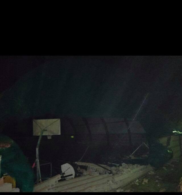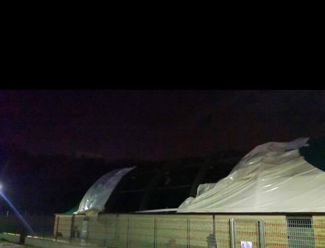Oltre al telone strappato dalla potenza del vento danni ci sono stati anche al muro di contenimento che ancora la struttura al terreno.