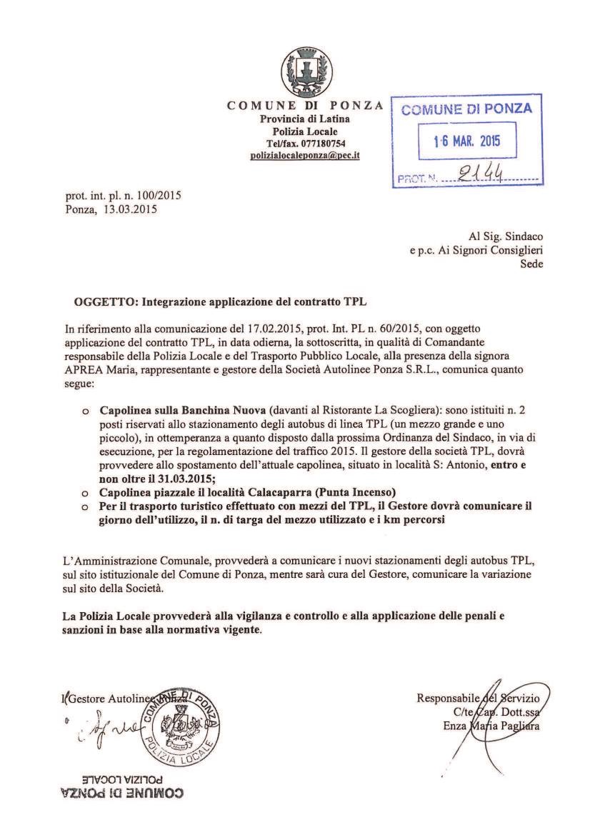Come si legge nella lettera qui riprodotta, anticipando l’Ordinanza del Sindaco sul traffico estivo, lo spostamento del capolinea deve avvenire entro fine marzo.