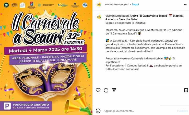 Non mancheranno ovviamente sfilate in maschera, stelle filanti, coriandoli, musica, balli e tantissimi scherzi per grandi e piccini. “La tradizionale sfilata partirà dal Piazzale Sieci e arriverà alla Terrazza sul Lungomare, con un’ampia area pedonale per dare spazio al divertimento di tutti!” questo è quanto si legge nel post Instagram pubblicato sulla pagina ufficiale @viviminturnoscauri.