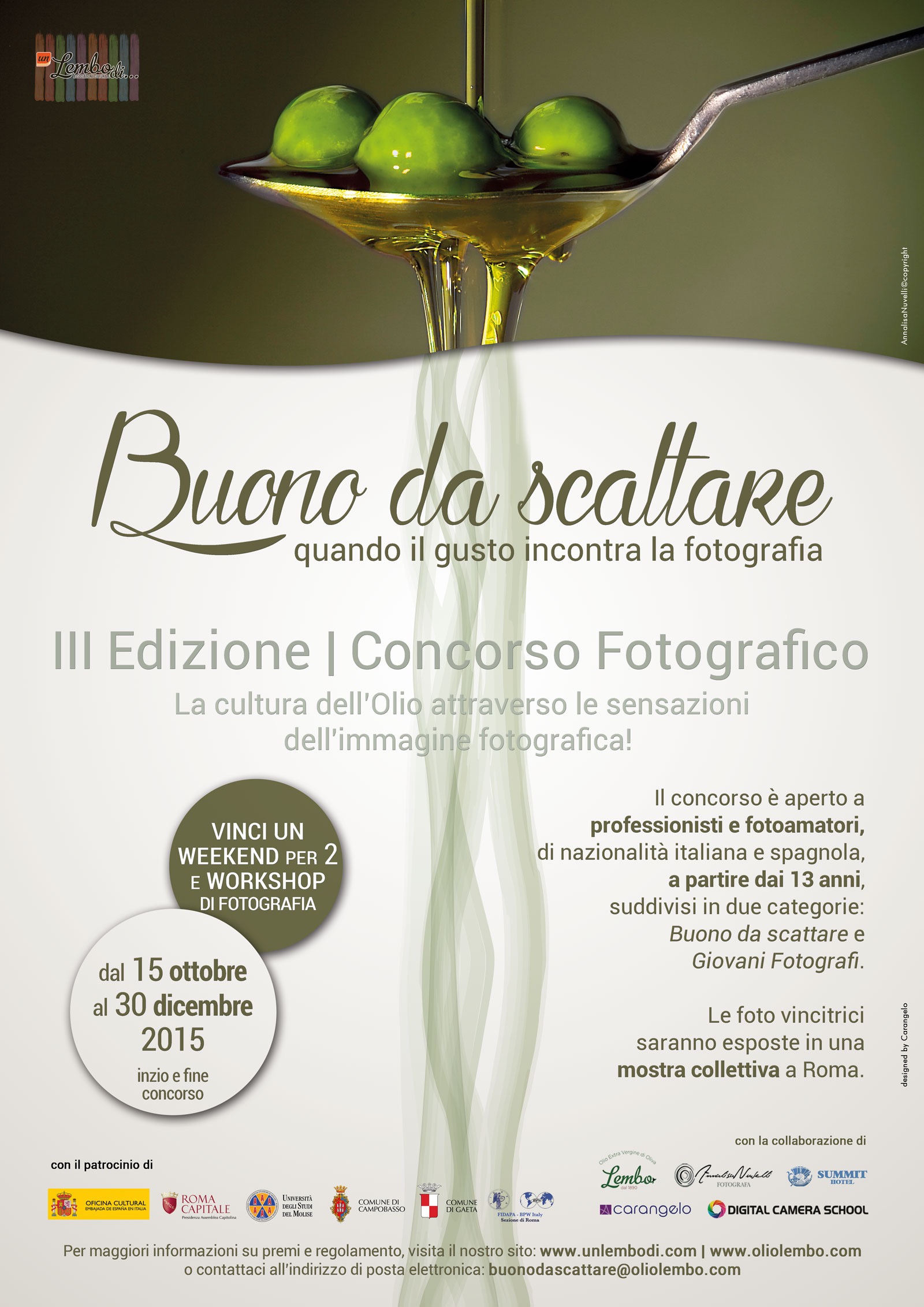 Dopo il grande successo della passata edizione, torna “Buono da scattare”(15 Ottobre- 30 dicembre 2015) il concorso fotografico volto alla promozione della cultura dell’olio, attraverso le sensazioni dell’immagine fotografica. L’iniziativa , indetta dall’Associazione Culturale “Un lembo di…”, in collaborazione con Olio Lembo e Annalisa Nuvelli Fotografie, si rivolge ai professionisti e fotoamatori di nazionalità italiana e spagnola. Il concorso prevede anche una categoria per le scuole, “Giovani Fotografi” dedicata ai più giovani e con meno esperienza, la cui età è compresa tra i 13 e i 18 anni.