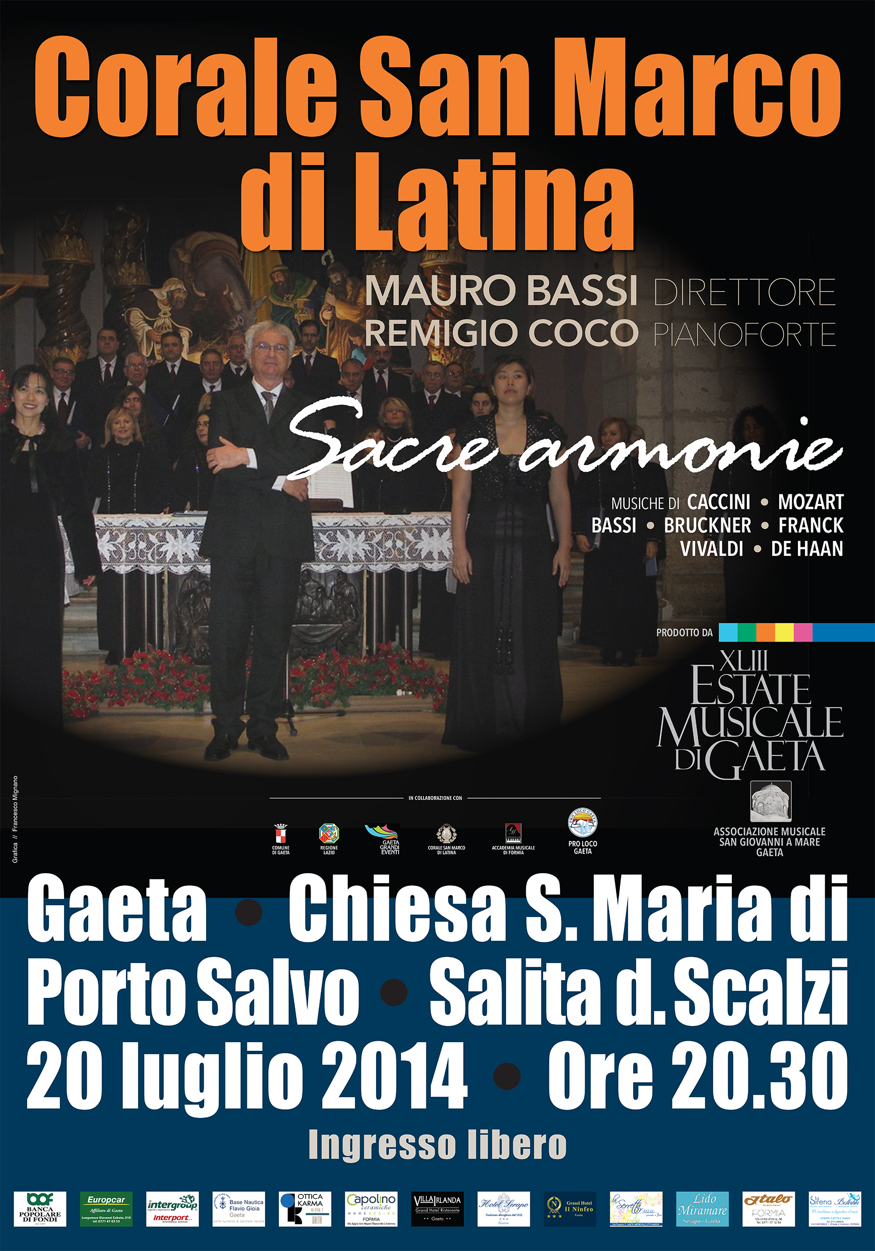 Qui, domenica 20 luglio alle ore 20.30 con ingresso libero, si tiene il terzo appuntamento della Estate Musicale di Gaeta 2014. Protagonista una delle più prestigiose e antiche istituzioni musicali della nostra regione: la Corale San Marco di Latina, attiva fin dall’anno di fondazione del capoluogo pontino.