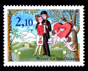 La giornata di domani, come tutti ben sappiamo e’ dedicata agli innamorati e, più genericamente, a tutte le persone che in qualche modo si vogliono bene. Nel corso degli anni diverse amministrazioni postali hanno ricordato San Valentino attraverso l’emissione di francobolli dalle più svariate rappresentazioni. Oggi ne ripropongo solamente un paio, dato che la vastità di immagini, renderebbe questo breve articolo troppo tecnico e poco discorsivo. La prima risale al 1985 e ripropone la celebre illustrazione degli “innamorati” di Raymond Peynet con un facciale da 2,10 franchi. Gli altri valori invece saranno emessi domani dalle Poste Austaliane e ripropongono da una parte, una sequenza di cuori e dall’altra la rosa; in entrambi e’ evidente la parola “Love”.
