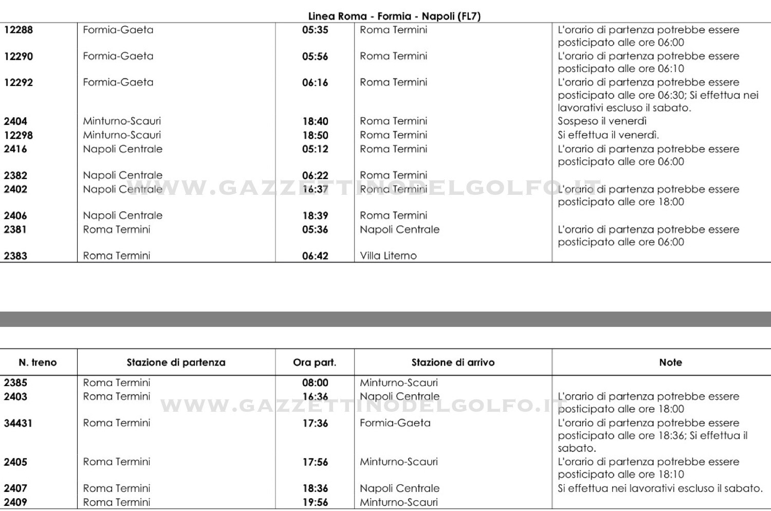 Nelle giornate di sciopero Trenitalia assicura servizi minimi di trasporto predisposti a seguito di accordi con le Organizzazioni sindacali. Nello specifico si allega l’elenco dei treni garantiti sulla linea Roma Termini-Formia/Gaeta.