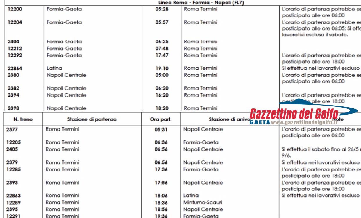 Come già anticipato nella giornata di ieri, domani sarà un giovedì da “bollino nero” per i pendolari che quotidianamente percorrono la FL7 che collega Roma al capoluogo campano, Via Formia-Gaeta. Ma Trenitalia comunica l’elenco dei treni garantiti.