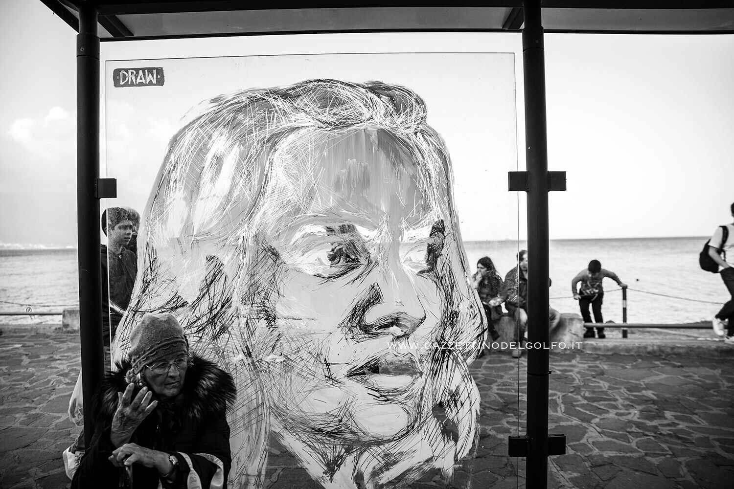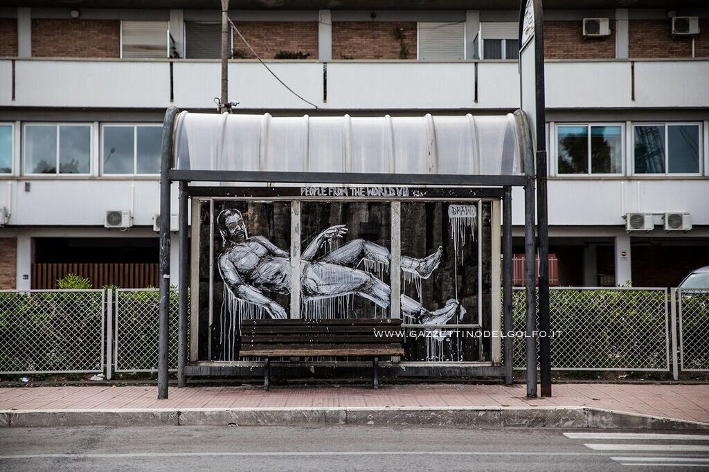 A Gaeta, il protagonista assoluto delle “Memorie Urbane Weeks” sarà Frederico Draw, chiamato dal curatore del Festival Davide Rossillo (Presidente di Turismo Creativo) a lasciare il segno sul vetro delle fermate dell’autobus della città, luogo simbolico di incontro di diverse etnie. 8 pensiline diventano 8 tele su cui l’artista portoghese graffia il colore applicato, in prevalenza nero e bianco, per dare vita a volti multiculturali dallo sguardo penetrante.