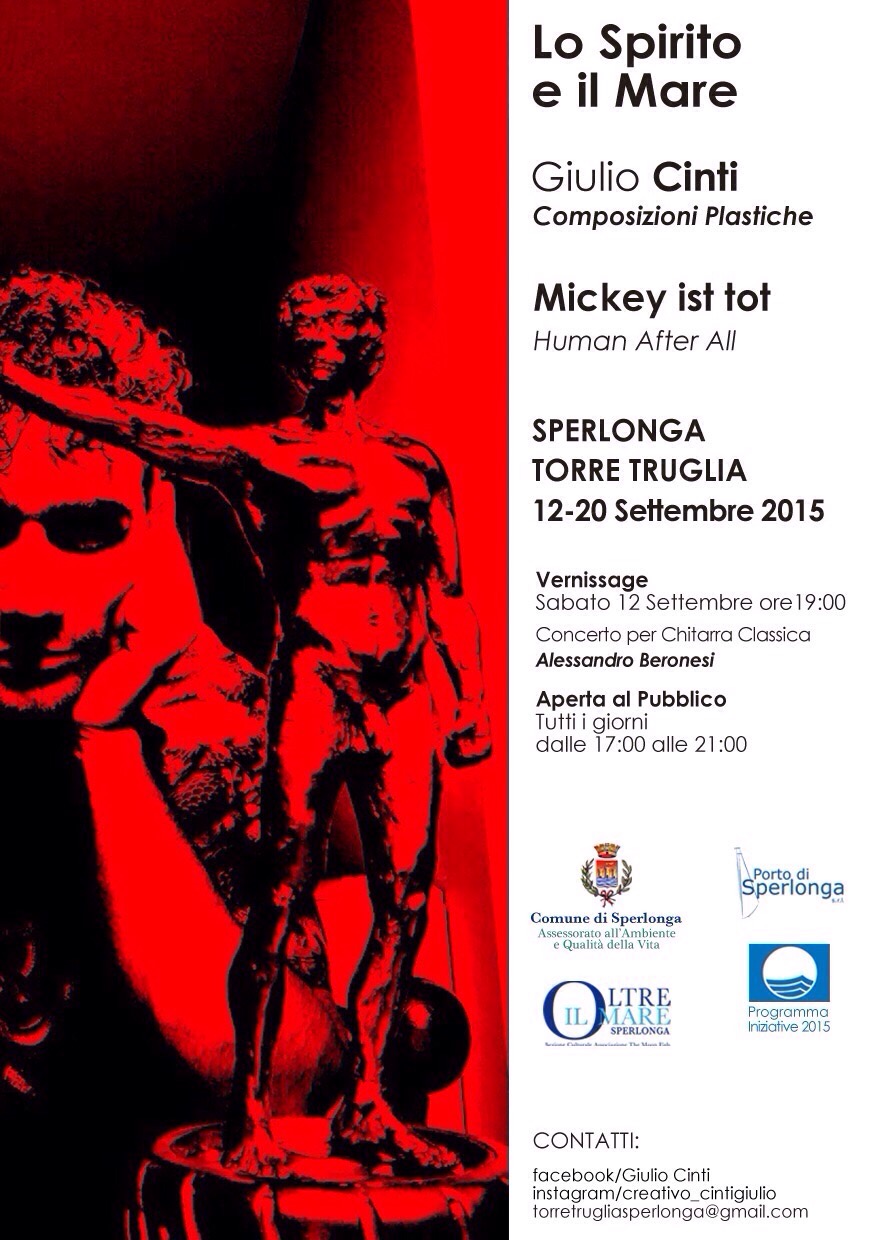 Alle 18,30, parte la mostra di scultura “MICKEY IST TOT – Human After All” dell’artista Giulio Cinti presso la Torre Truglia. 24 anni, Cinti coltiva la passione per la progettazione, il design di gioielli e la lavorazione dei metalli da quando ne aveva 13 di anni.