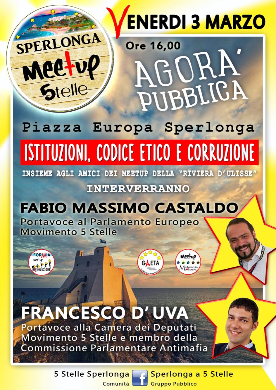 Il Meet Up 5 stelle Sperlonga invita tutti i cittadini in Piazza Europa Venerdi 3 Marzo alle ore 16.00.