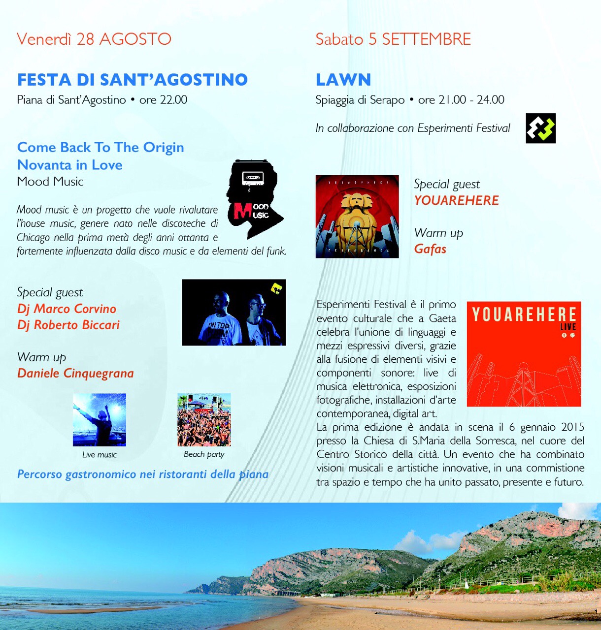 Gaeta, 27 agosto 2015. Continua l’estate gaetana con “Spiagge in festa”, nuovi appuntamenti da non perdere dedicati agli amanti della musica più in voga, in nuove location: le spiagge di Sant’Agostino e Serapo. La manifestazione è promossa dal Comune di Gaeta in sinergia con i commercianti della città e l’Associazione Gaeta Dinamica.