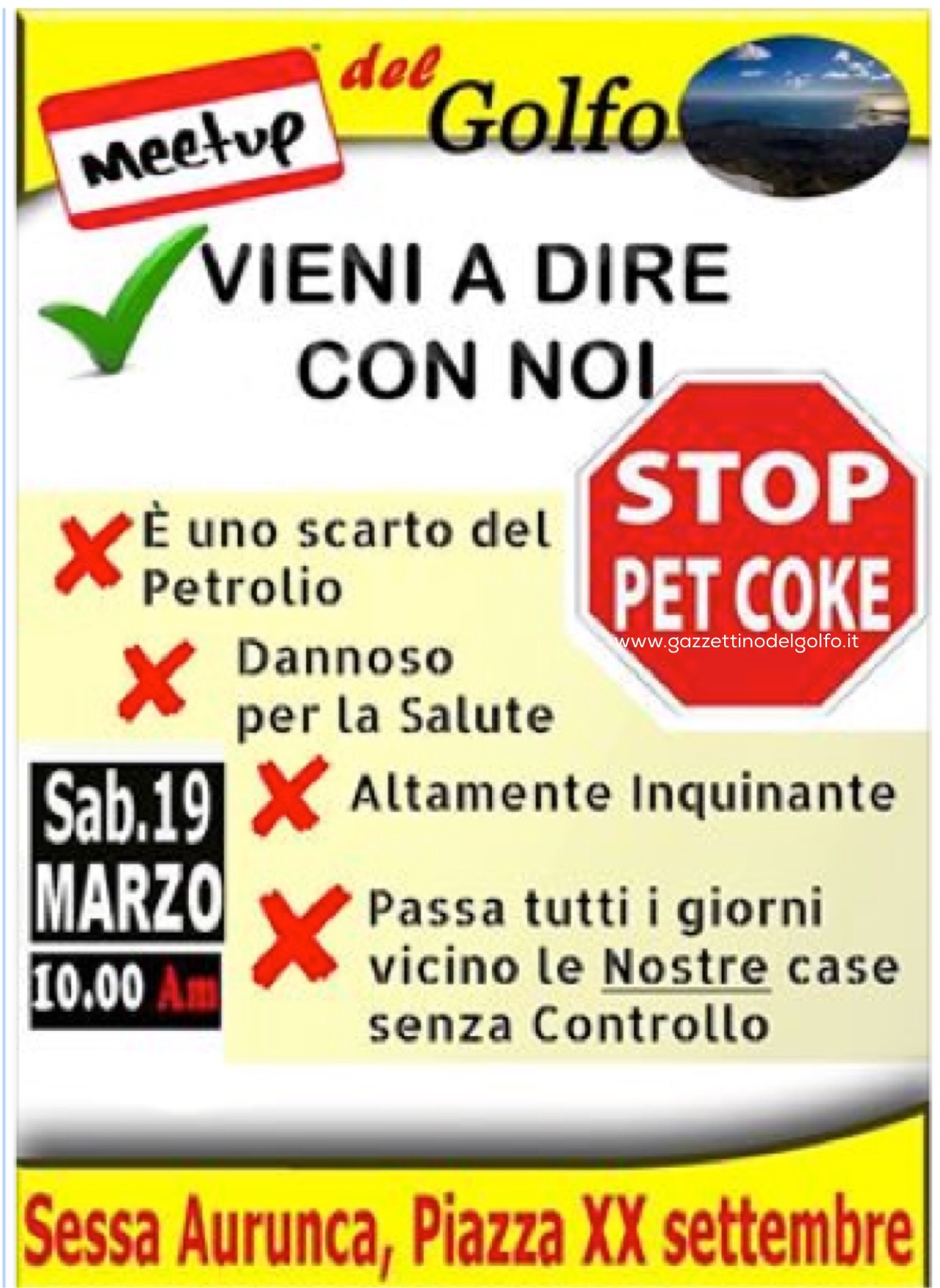 Sabato 19 Marzo il Movimento 5 Stelle sarà presente con i suoi rappresentanti e attivisti a Sessa Aurunca alle ore 10 in piazza XX Settembre per dire STOP all’inquinamento da pet coke, un carbone artificiale che contiene impurità e può essere usato solo come combustibile, a causa del suo elevato contenuto di zolfo e metalli pesanti risulta altamente pericoloso per l’uomo e per essere impiegato/depurato ha bisogno di filtri particolari.L’obiettivo della manifestazione è tutelare la salute e l’ambiente in un’area già con grossi problemi.