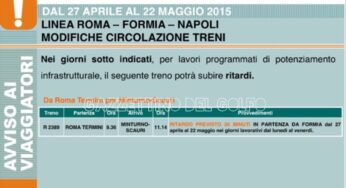 Trenitalia rende noto che, dal 27 aprile al 22 maggio sulla tratta Roma-Formia-Napoli, il treno con partenza da Roma Termini e diretto…