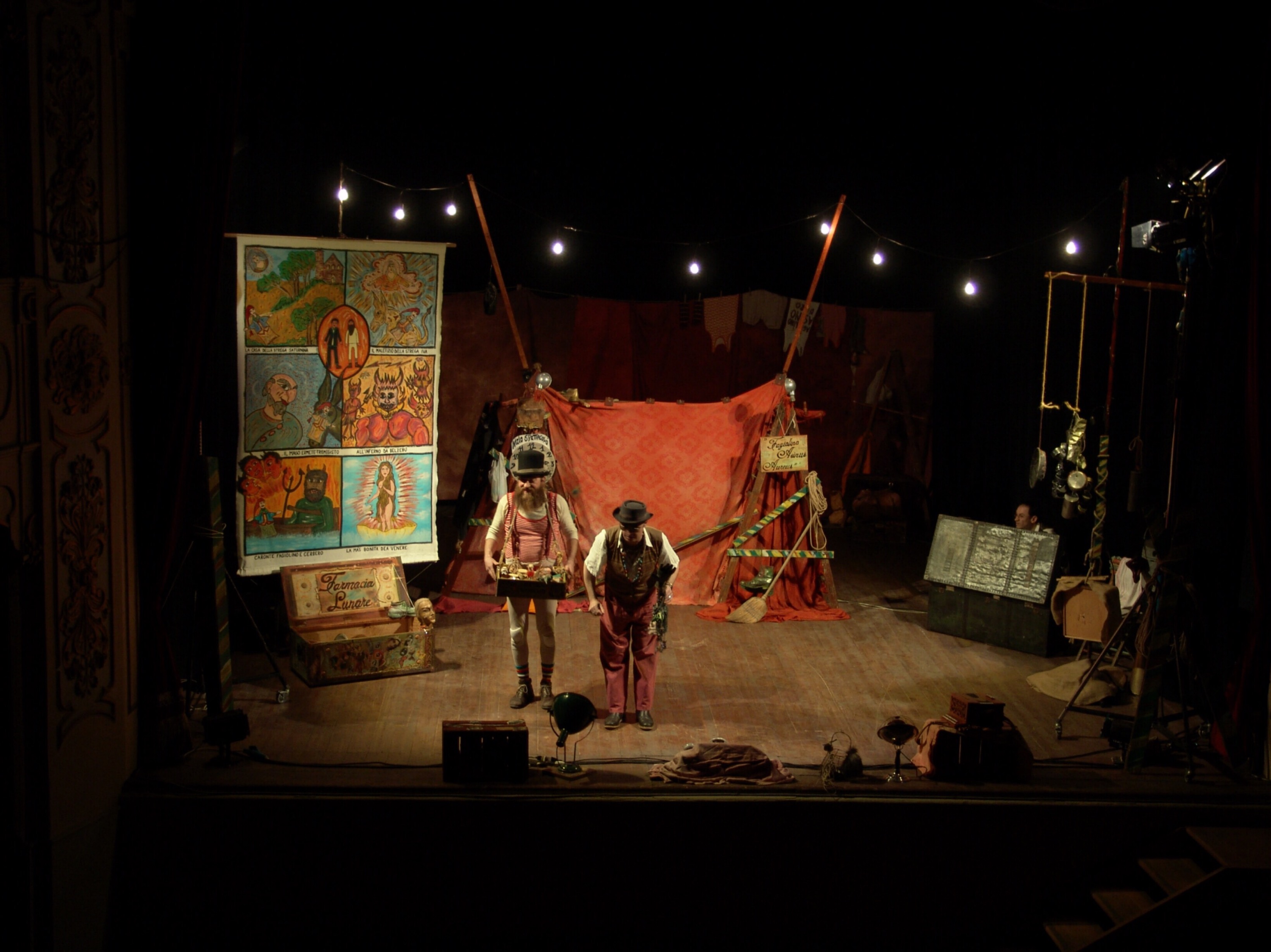 E’ tipicamente uno show d’arte varia, sia per l’impatto visivo, che richiama certamente ad un decadente circo ottocentesco, sia per la sgangherata struttura scenica – “coreografica”, di disorganizzati guitti ed artisti ambulanti. La comicità semplice ed immediata è uno degli elementi costanti che lega i tre differenti generi che scandiscono lo spettacolo: il Teatro dei Burattini, l’arte antica del Cantastorie, la ”Giocoleria” degli artisti di strada. La fonte d’ispirazione per questa “maldestra” operina è “l’Asino d’Oro” di Lucio Apuleio, amante della magia, abile oratore ed esperto scrittore, che disgraziatamente per lui, è inciampato nel teatrino dello Zambutèn, “burbero e benefico” venditore – truffatore – spacciatore, di unguenti e rimedi ciarlataneschi, e della sua “spalla” Verruca.