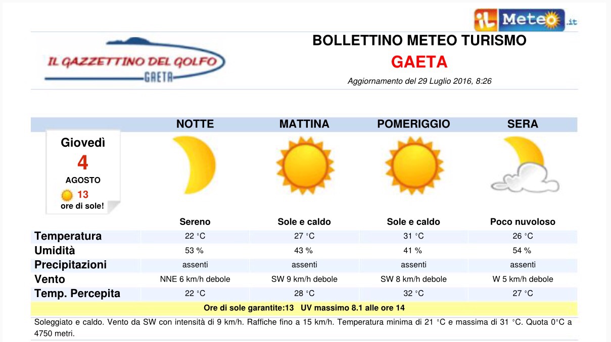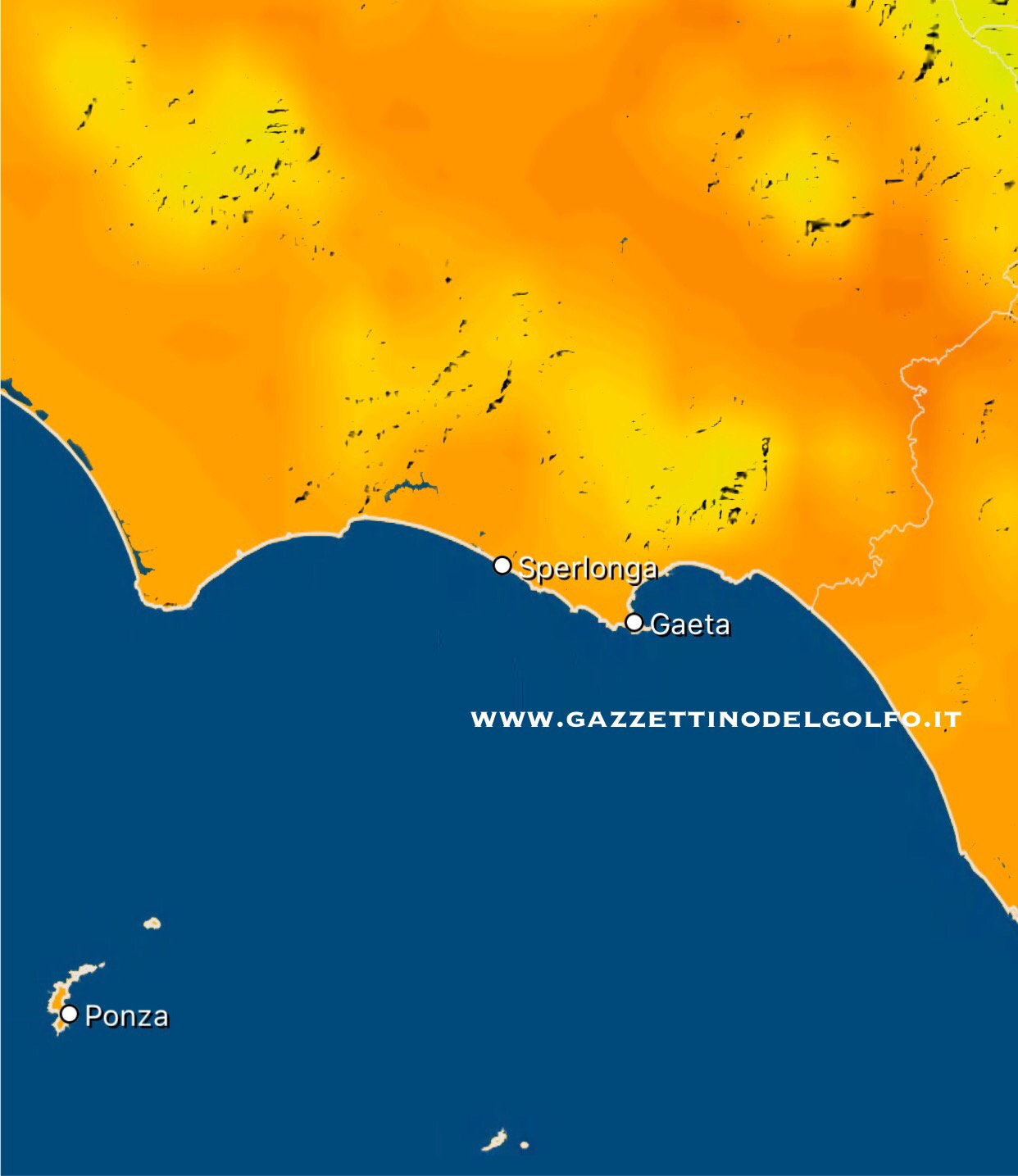 Nel Golfo di Gaeta per le giornate di sabato e domenica è atteso bel tempo con sole splendente: Le temperature si attesteranno sui 32ºC come massima, e 25ºC come minima. I venti saranno al mattino assenti o deboli e direzione variabile/Sudovest con mare poco mosso.