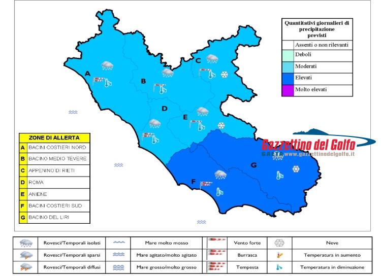 Nella prima foto le precipitazioni previste le le ore 08:00 odierne, nella seconda invece, il bollettino meteo della regione Lazo.