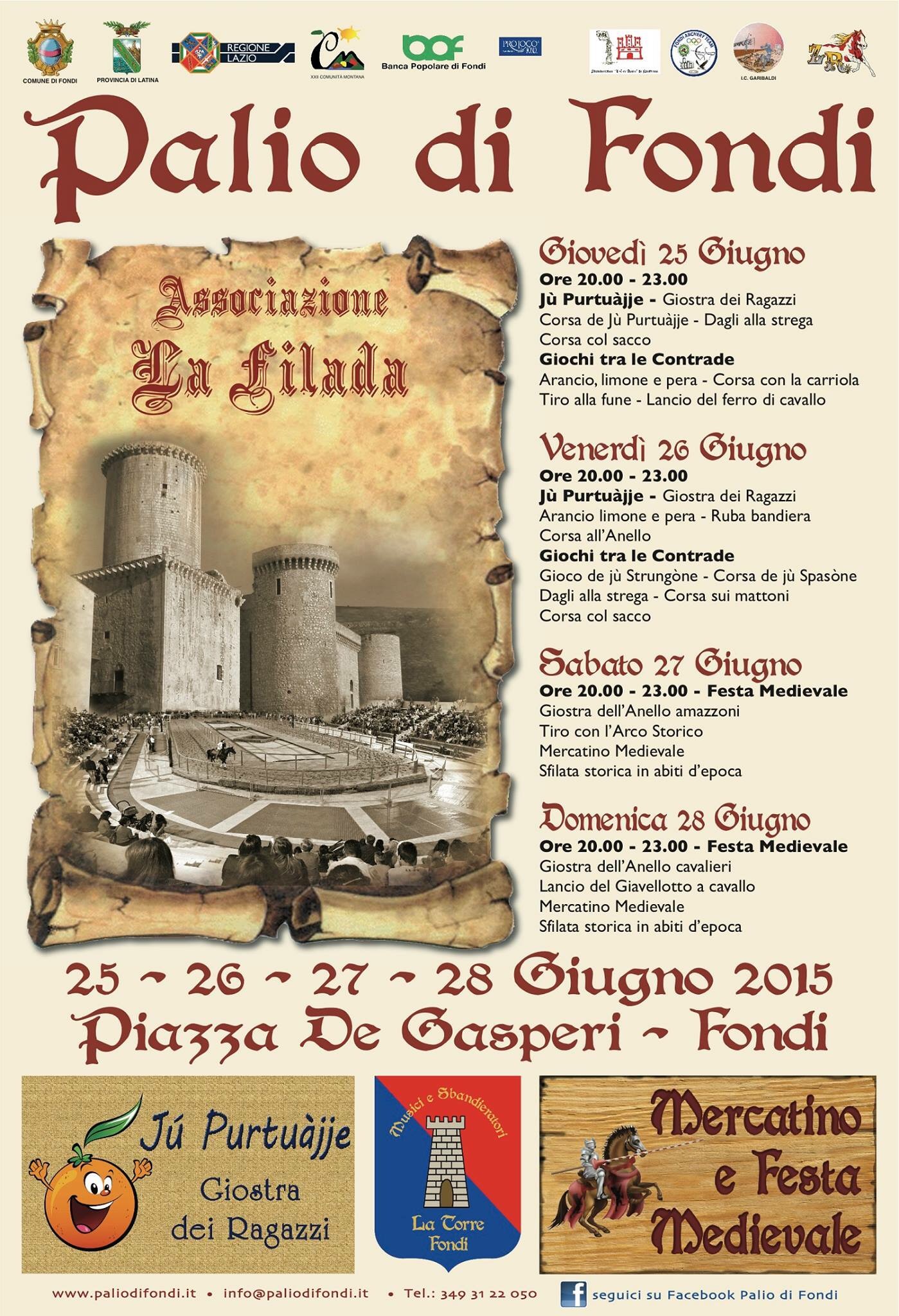 L’incantevole scenario di Piazza De Gasperi ospiterà dal 25 al 28 Giugno la quarta edizione del Palio di Fondi, organizzato dall’associazione La Filada con lo scopo di riscoprire e rivalutare le nostre tradizioni, le culture contadine, i mestieri e i giochi di un tempo. Un prezioso patrimonio che va rivitalizzato e tramandato e che può diventare divertimento e piacere per tutti. Si vuol dar vita a una manifestazione dal forte richiamo turistico capace di aggregare le varie espressioni della nostra cultura mettendo in vetrina le bellezze storico – artistico – ambientali. Il tutto caratterizzato da una sana, robusta, gioiosa e giocosa rivalità fra le diverse realtà del territorio.