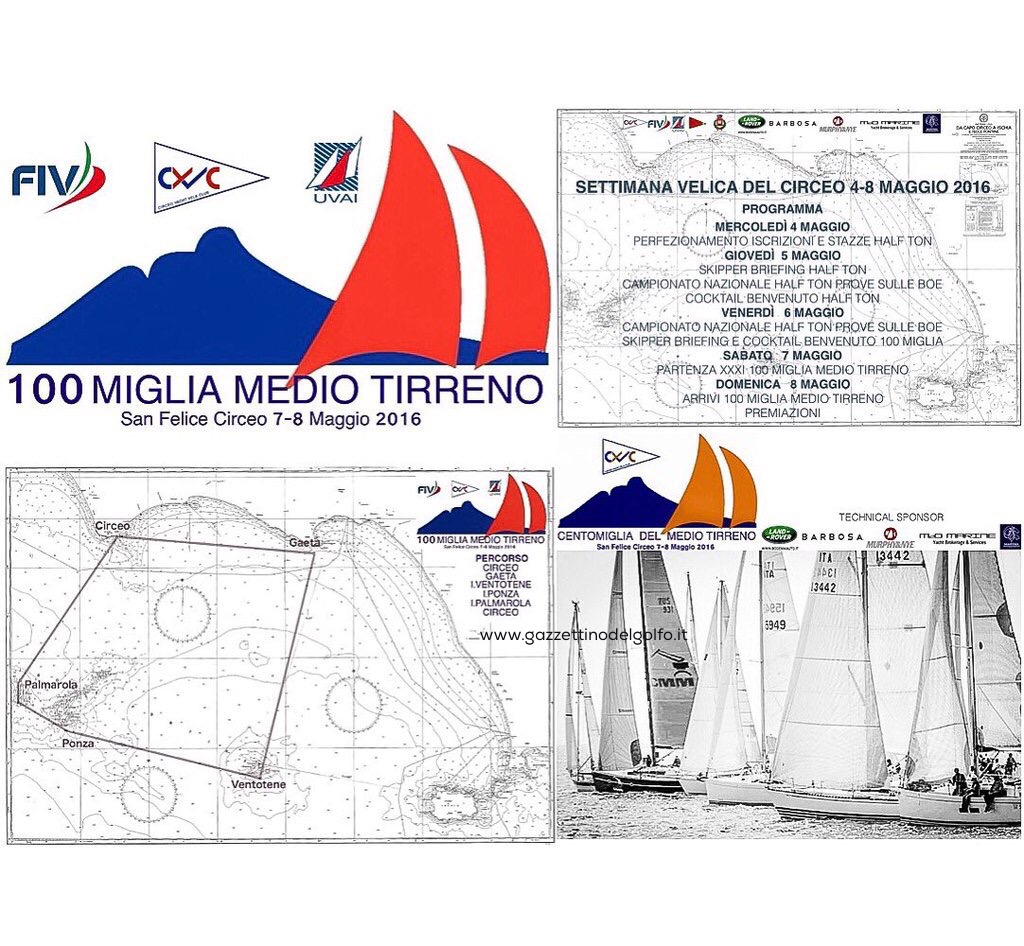 Giunta alla sua XXXI^ edizione la regata Centomiglia del Medio Tirreno in programma il 7- 8 Maggio prossimi al Circeo, si appresta ad essere uno degli appuntamenti della vela d’altura più importanti nel panorama velico nazionale.Ben 50 imbarcazioni iscritte provenienti dai maggiori porti Italiani si sfideranno in uno dei tratti di costa più belli al mondo, il percorso prevede una navigazione di 100 miglia inizialmente dal Circeo a Gaeta per poi proseguire attraverso le Isole di Ventotene, Ponza e Palmarola boe naturali per una rotta d’altri tempi.