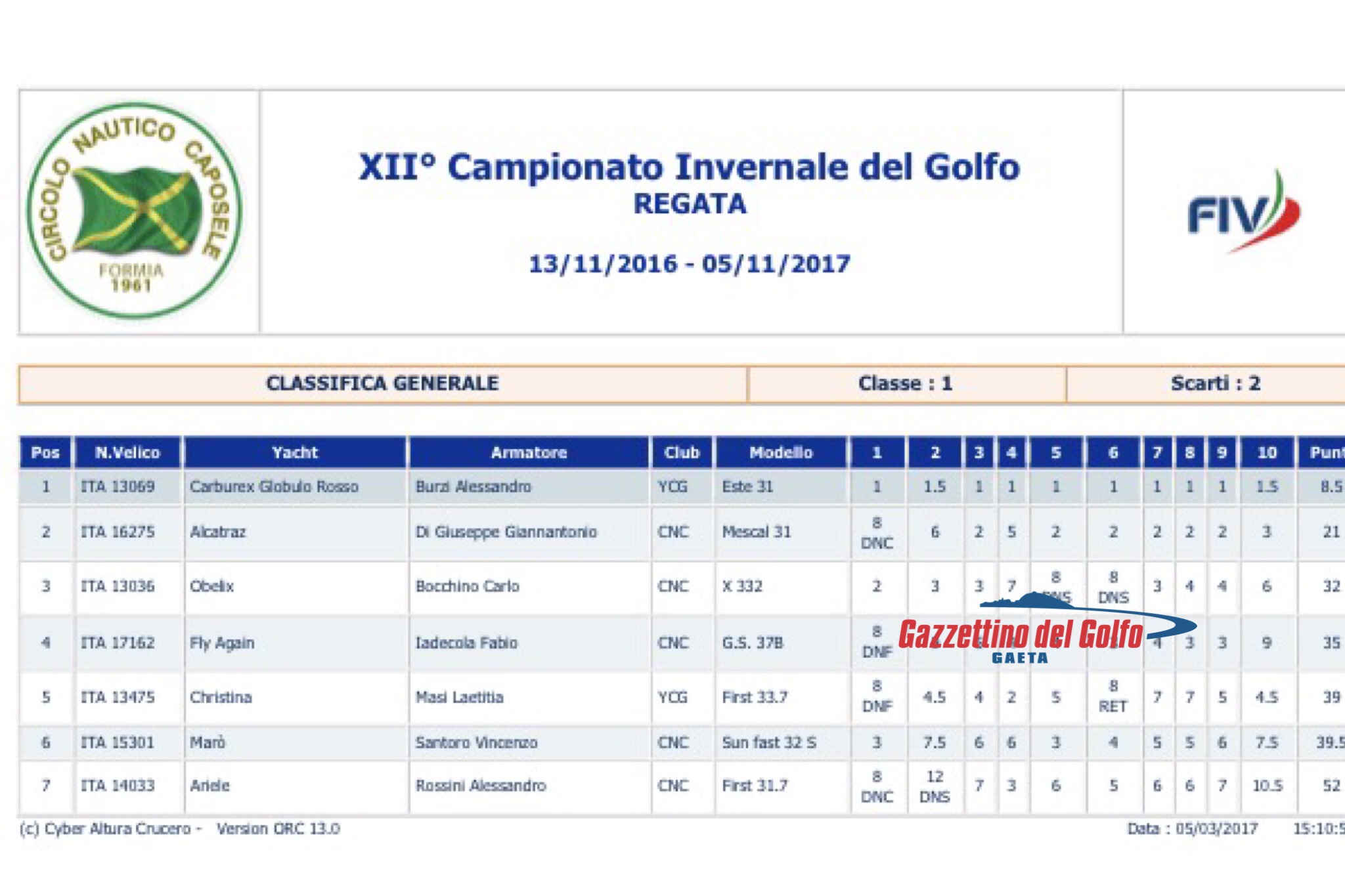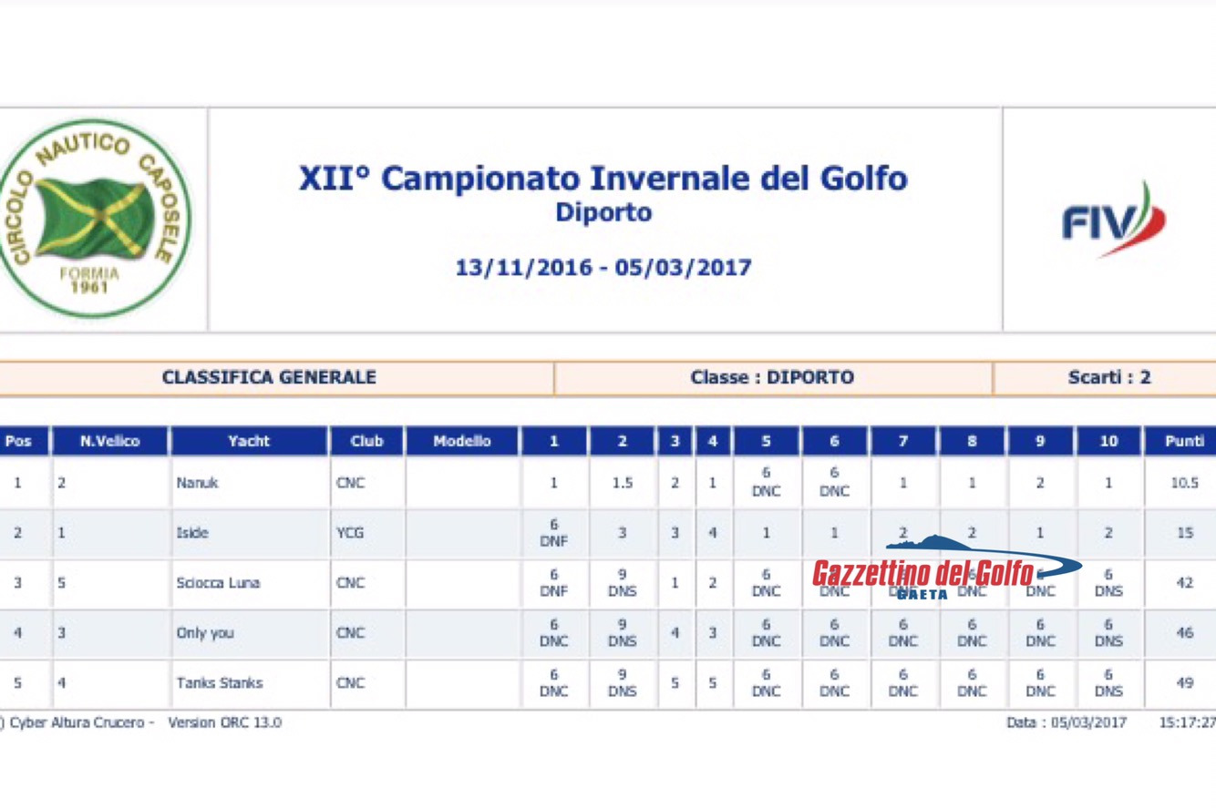 Globulo Rosso Carburex di Alessandro Burzi (YCGaeta), vincendo anche questa regata vince il XII Campionato Invernale, con tutti primi un vero record, al secondo posto Alcatraz di Giannantonio Di Giuseppe (CNCaposele) che chiude il campionato al secondo posto, migliorando di molto le su performance rispetto al 2016, la terza piazza in classifica andava ad Obelix di Carlo Bocchino (CNCaposele)