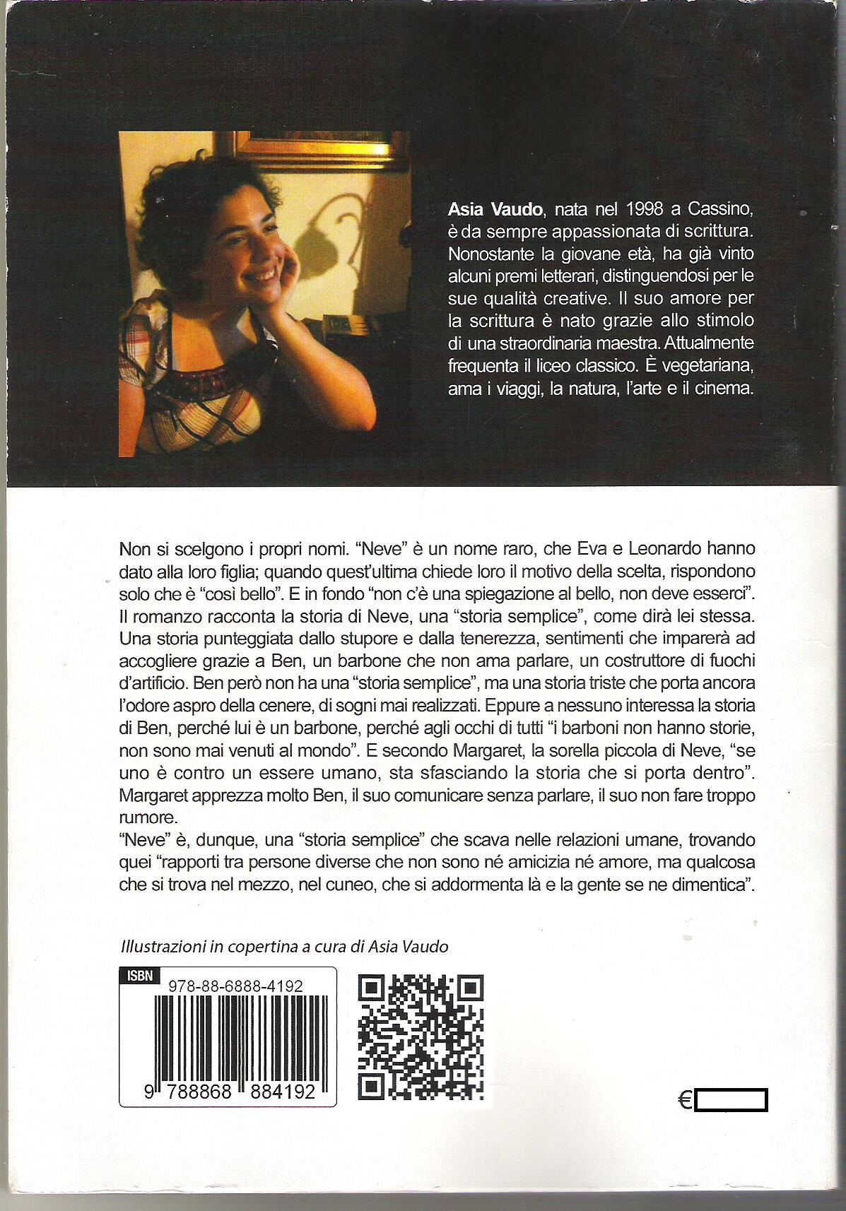Non si scelgono i propri nomi. “Neve” è un nome raro, che Eva e Leonardo hanno dato alla loro figlia; quando quest’ultima chiede loro il motivo della scelta, rispondono solo che è “così bello”. E in fondo “non c’è una spiegazione al bello, non deve esserci”. Il romanzo racconta la storia di Neve, una “storia semplice”, come dirà lei stessa. Una storia punteggiata dallo stupore e dalla tenerezza, sentimenti che imparerà ad accogliere grazie a Ben, un barbone che non ama parlare, un costruttore di fuochi d’artificio. Ben però non ha una “storia semplice”, ma una storia triste che porta ancora l’odore aspro della cenere, di sogni mai realizzati. Eppure a nessuno interessa la storia di Ben, perché lui è un barbone, perché agli occhi di tutti “i barboni non hanno storie, non sono mai venuti al mondo”. E secondo Margaret, la sorella piccola di Neve, “se uno è contro un essere umano, sta sfasciando la storia che si porta dentro”. Margaret apprezza molto Ben, il suo comunicare senza parlare, il suo non fare troppo rumore. “Neve” è, dunque, una “storia semplice” che scava nelle relazioni umane, trovando quei “rapporti tra persone diverse che non sono né amicizia né amore, ma qualcosa che si trova nel mezzo, nel cuneo, che si addormenta là e la gente se ne dimentica”.