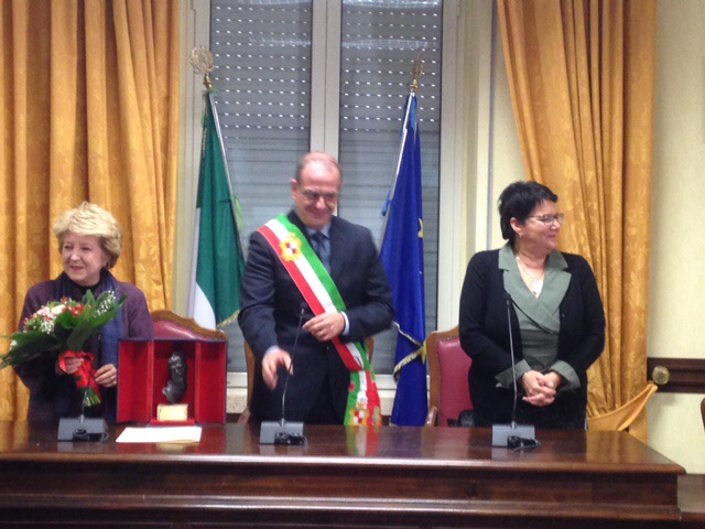 Gaeta, 23 dicembre 2015. Premio Una vita per l’Arte 2105 a Michela Di Macco, professore ordinario di Storia dell’arte moderna presso la Facoltà di Lettere e Filosofia della Sapienza Università di Roma. Il riconoscimento che la Città di Gaeta, su indicazione dell’Associazione Culturale Novecento e della Pinacoteca Comunale d’Arte Contemporanea, assegna ad un personaggio che ha dedicato la propria vita all’Arte distinguendosi per passione e qualità del lavoro, è stato consegnato dal Sindaco Cosmo Mitrano nella cerimonia ufficiale svoltasi domenica 20 dicembre u.s., nell’Aula Consiliare del Palazzo Comunale di Gaeta.