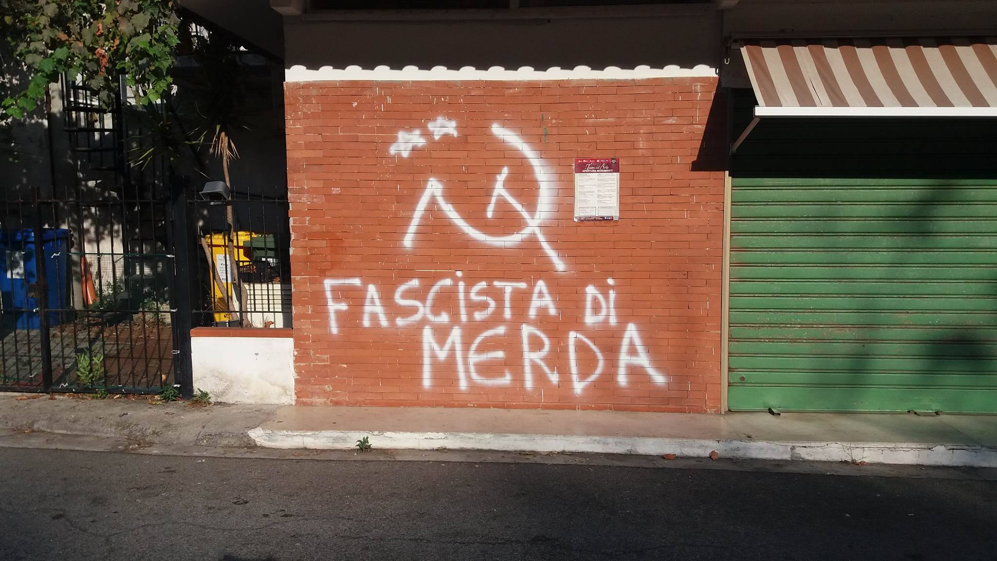 Con una bomboletta spray, di colore bianco, hanno scritto “acab”, acronimo di All Cops Are Bastards (in italiano: tutti i poliziotti sono bastardi) e “Fascista di merda” sotto un logo di una Falce e Martello.