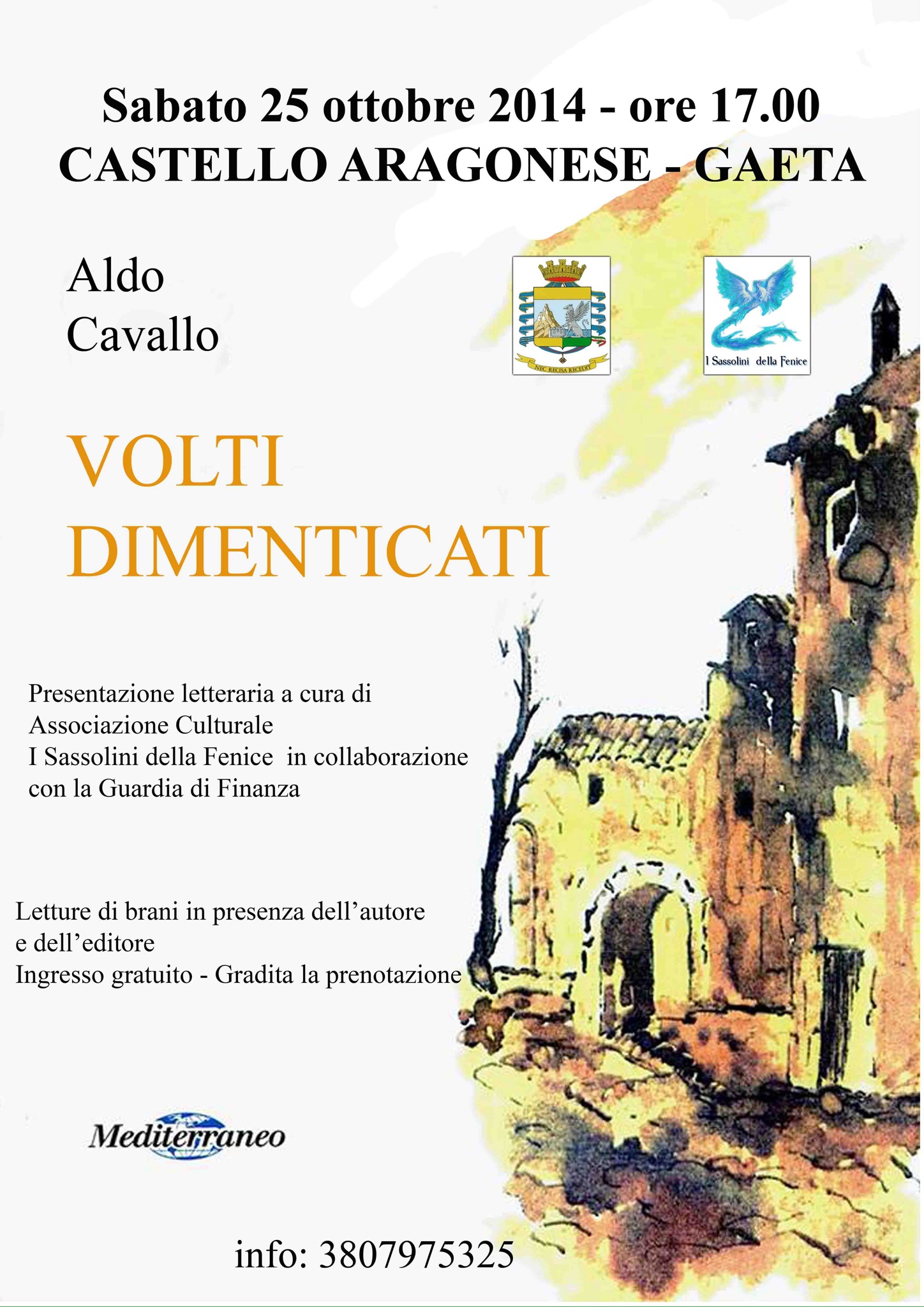 Si terrà il 25 ottobre 2014 alle ore 17.00 la presentazione letteraria del volume Volti Dimenticati dello scrittore e giornalista Aldo Cavallo. L’iniziativa, realizzata dall’associazione culturale I Sassolini della Fenice, in collaborazione con il Comando della Scuola Nautica della Guardia di Finanza di Gaeta, proporrà al pubblico presente una presentazione letteraria originale e interattiva. L’evento si terrà nel Castello Aragonese il cui spazio è gentilmente messo a disposizione dal Comandante della Scuola Nautica della Guardia di Finanza, Colonnello Cera. Una scelta importante quella di collocare la presentazione in questo suggestivo luogo della città, spiega il presidente dell’associazione culturale I Sassolini della Fenice, dott.ssa Julie Biasucci: si tratta di una scelta senz’altro strategica, se oso definirla tale. Volti Dimenticati è una raccolta di storie toccanti risalenti alla Seconda Guerra Mondiale, il castello è una roccaforte che ospita un’istituzione che lotta per la legalità. Per definire il concetto di legalità, si dovrebbero chiamare in causa valori che sono cari all’autore, all’associazione e che dovrebbero essere cari a tutti, lettori e non. Un presentazione promettente durante la quale brani scelti saranno letti dai ragazzi della Fenice, passeggiando per la parte bassa del castello, fino a giungere alle celle. Circa un’ora di pura letteratura in presenza dell’autore – Aldo Cavallo – e dell’editore della Mediterraneo, dott. Alessandro Zannini. Non conoscete Volti Dimenticati? Consultate pure la rubrica della Nuova Gazzetta di Gaeta, Il Libro della Settimana, il libro è stato oggetto di recensione il 23 agosto scorso! Vi aspettiamo numerosi.
